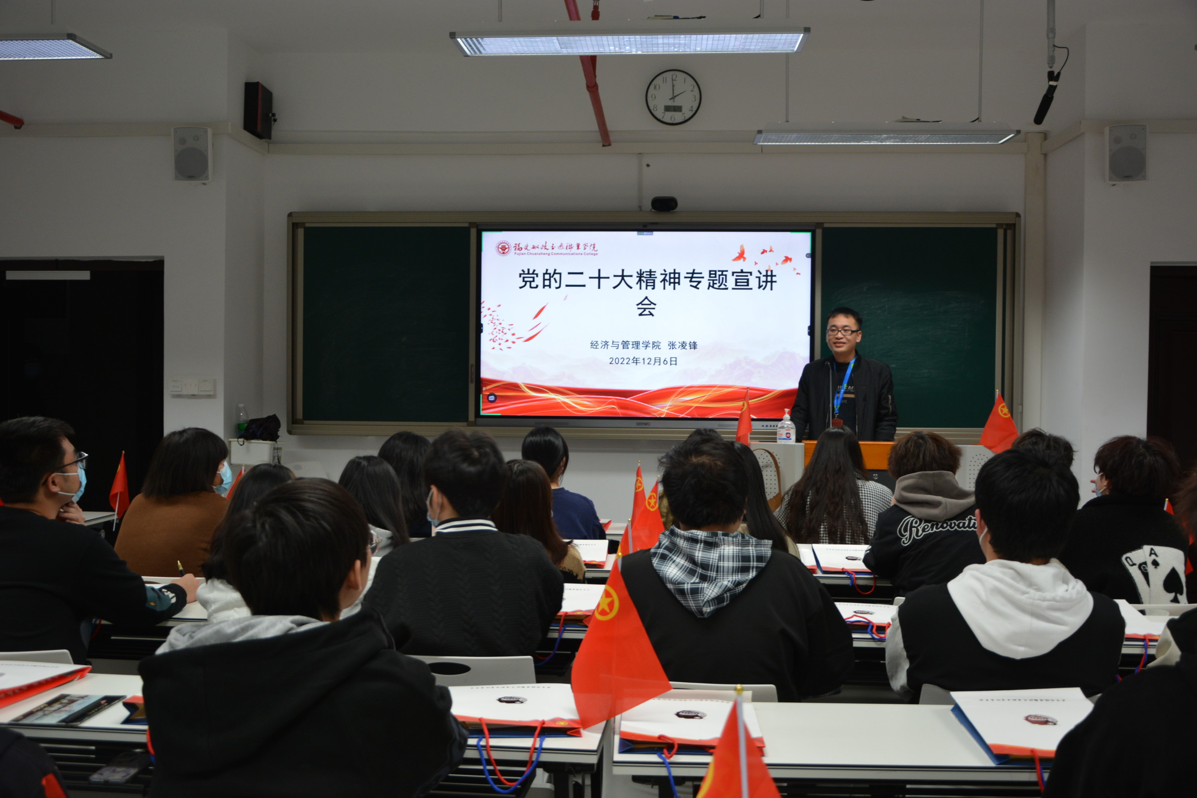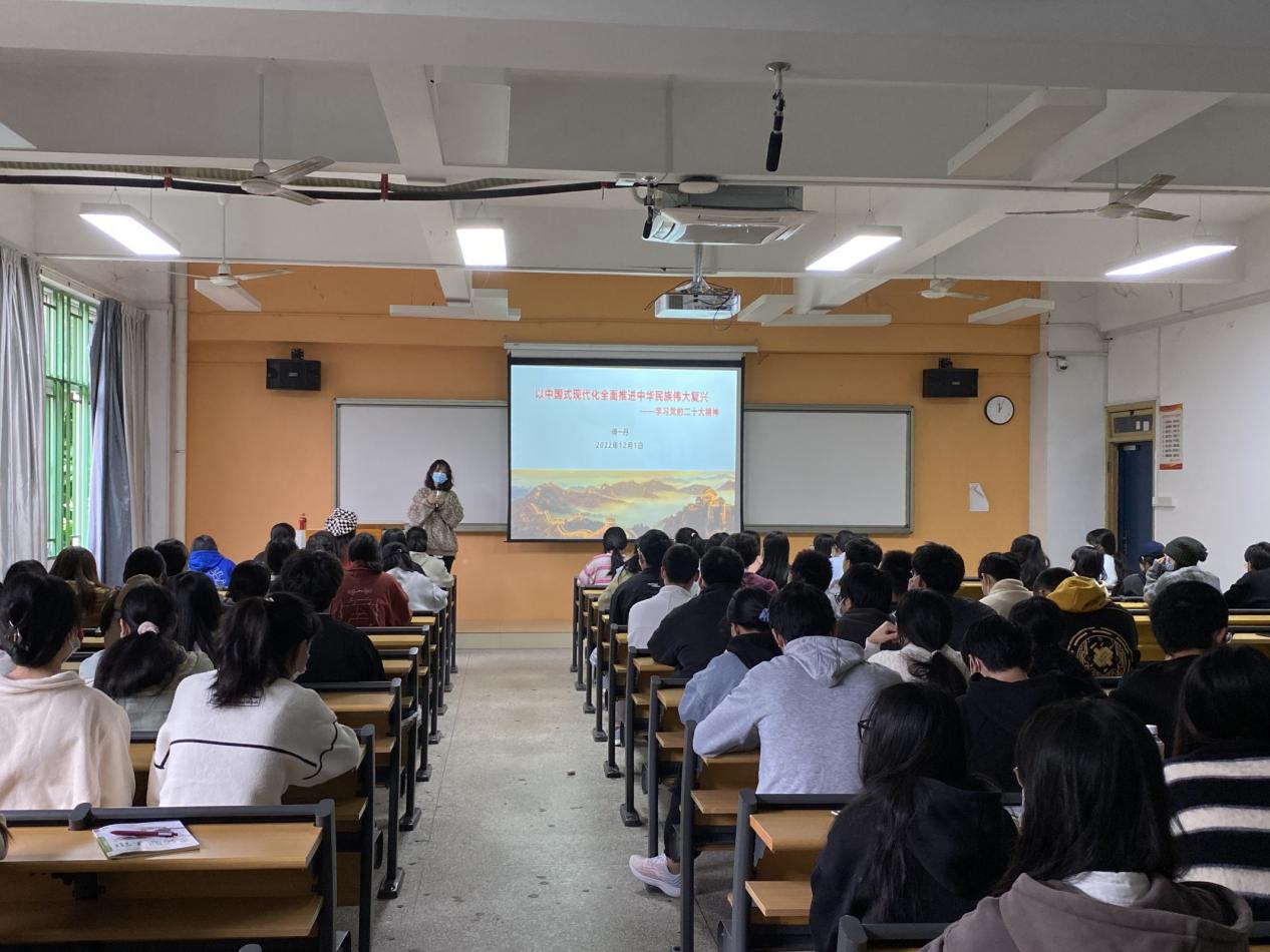 我院團委宣傳委員王琳以黨的二十大精神為主線,從黨的二十大召開的重大意義、過去5年的工作成就和新時代10年的偉大變革、中國化時代化的馬克思主義為什么行、全面建設社會主義現(xiàn)代化國家的重大任務和以中國式現(xiàn)代化全面推進中華民族偉大復興青年學子的使命擔當?shù)确矫孢M行了系統(tǒng)解讀和深入闡釋。
