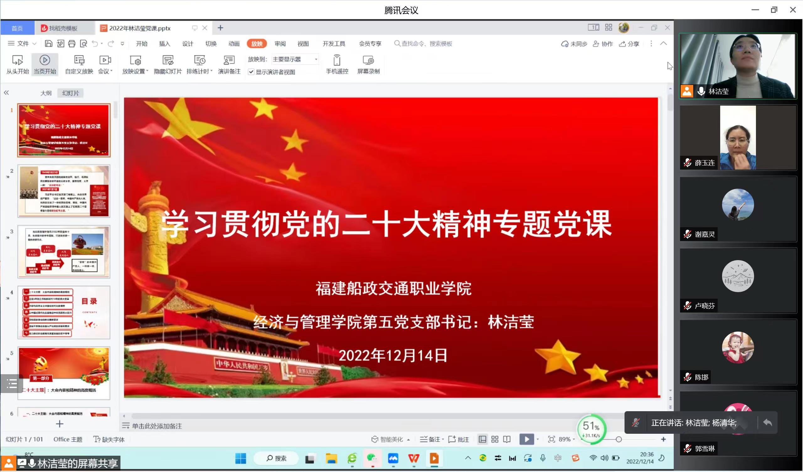 為深入學(xué)習(xí)貫徹黨的二十大精神, 12月14日,經(jīng)濟(jì)與管理學(xué)院第五黨支部書記林潔瑩以《學(xué)習(xí)貫徹黨的二十大精神》為題,通過“支部書記上黨課”的形式進(jìn)行黨的二十大精神專題宣講,第五黨支部全體黨員教師通過線上形式參加此次會(huì)議。