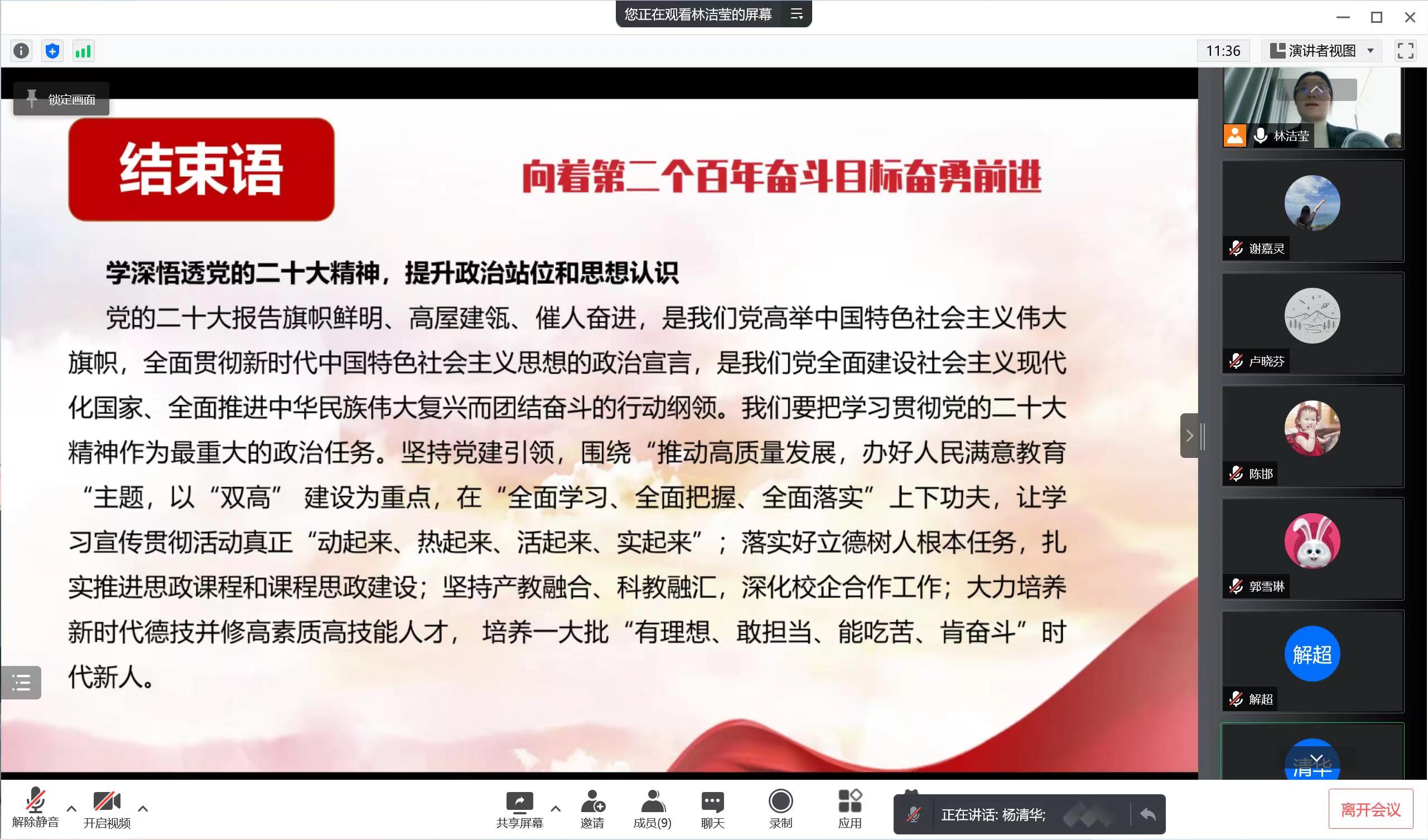 此次專題宣講,圍繞黨的二十大鮮明主題、重大意義、報(bào)告的15個(gè)方面內(nèi)容進(jìn)行解讀,聚焦新論述新論斷,重點(diǎn)對(duì)黨的二十大報(bào)告的“關(guān)鍵詞”進(jìn)行了詳細(xì)闡釋。講授過程緊密結(jié)合國內(nèi)外形勢,穿插個(gè)人深入思考和現(xiàn)實(shí)案例,深入淺出,主旨鮮明地揭示了報(bào)告精髓和要義。黨課最后,林潔瑩同志強(qiáng)調(diào),全體師生要把學(xué)習(xí)貫徹黨的二十大精神作為當(dāng)前和今后一個(gè)時(shí)期的首要政治任務(wù),在全面學(xué)習(xí)、全面把握、全面落實(shí)上下功夫,學(xué)深悟透,準(zhǔn)確學(xué)習(xí)把握黨的二十大精神核心要義和豐富內(nèi)涵,把學(xué)習(xí)貫徹黨的二十大精神和學(xué)院重點(diǎn)工作結(jié)合起來,以黨的二十大精神為引領(lǐng),立足本職工作,堅(jiān)守培養(yǎng)社會(huì)主義建設(shè)者和接班人的育人本色,在新時(shí)代新征程上為學(xué)院轉(zhuǎn)型發(fā)展作出新的貢獻(xiàn)!