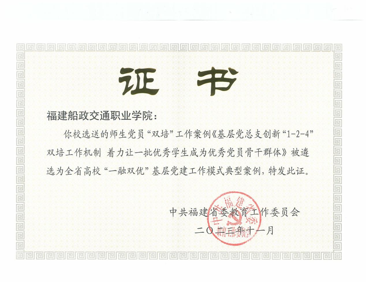 近日,省委教育工委公布全省高?!耙蝗陔p優(yōu)”基層黨建工作模式典型案例入選名單。我院工作案例《基層黨總支創(chuàng)新“1-2-4”雙培工作機(jī)制 著力讓一批優(yōu)秀學(xué)生成為優(yōu)秀黨員骨干群體》入選高職高專組師生黨員“雙培”工作案例。
