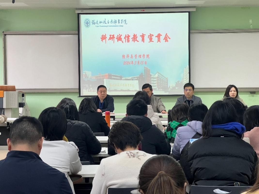 科研誠(chéng)信是學(xué)術(shù)發(fā)展的基石,是科學(xué)創(chuàng)新的根本。習(xí)近平總書記強(qiáng)調(diào),要營(yíng)造良好學(xué)術(shù)環(huán)境,弘揚(yáng)學(xué)術(shù)道德和科研倫理??萍紕?chuàng)新是國(guó)家發(fā)展形勢(shì)所需、大勢(shì)所趨。加強(qiáng)科研誠(chéng)信建設(shè),對(duì)營(yíng)造良好的學(xué)術(shù)環(huán)境,引導(dǎo)科研人員堅(jiān)守學(xué)術(shù)誠(chéng)信、維護(hù)學(xué)術(shù)尊嚴(yán)具有重要意義。為此,經(jīng)濟(jì)與管理學(xué)院于2024年3月12日在求實(shí)樓407教室開展了“科研誠(chéng)信”教育宣貫會(huì)。本次會(huì)議以講座形式開展,吳吉明副院長(zhǎng)做“踐行科研誠(chéng)信 做合格科研人”的報(bào)告,經(jīng)濟(jì)與管理學(xué)院全體教師參加了本次會(huì)議。