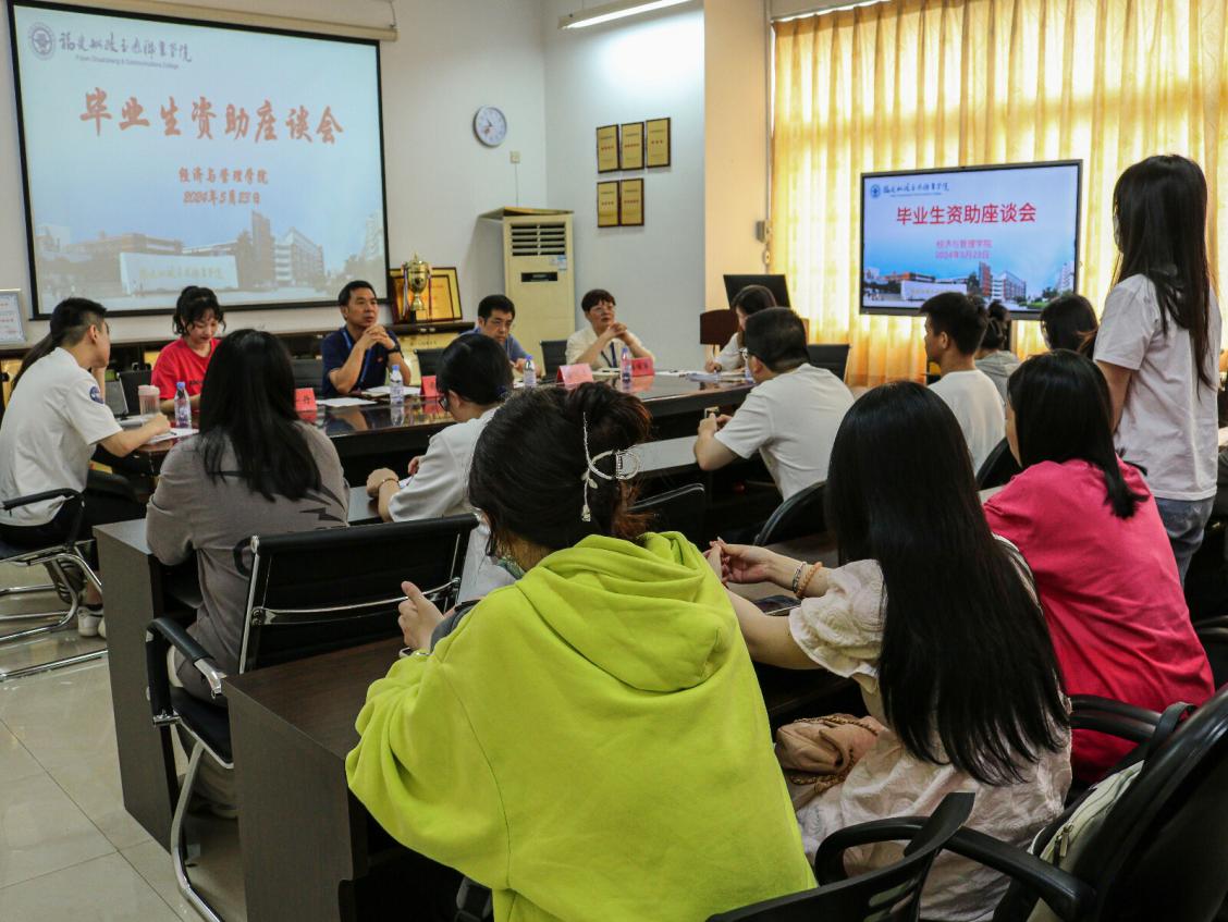 為進(jìn)一步普及國家助學(xué)貸款政策,強(qiáng)化畢業(yè)生的誠信意識和感恩之心,我院于5月23日上午在求實(shí)樓412會議室舉辦2024屆畢業(yè)生資助座談會。本次會議由學(xué)院團(tuán)委書記傅一丹主持,黨總支書記俞素平、院長房曰榮、副書記林麗萍、資助負(fù)責(zé)人、21級輔導(dǎo)員、21級畢業(yè)生代表參加了座談會。