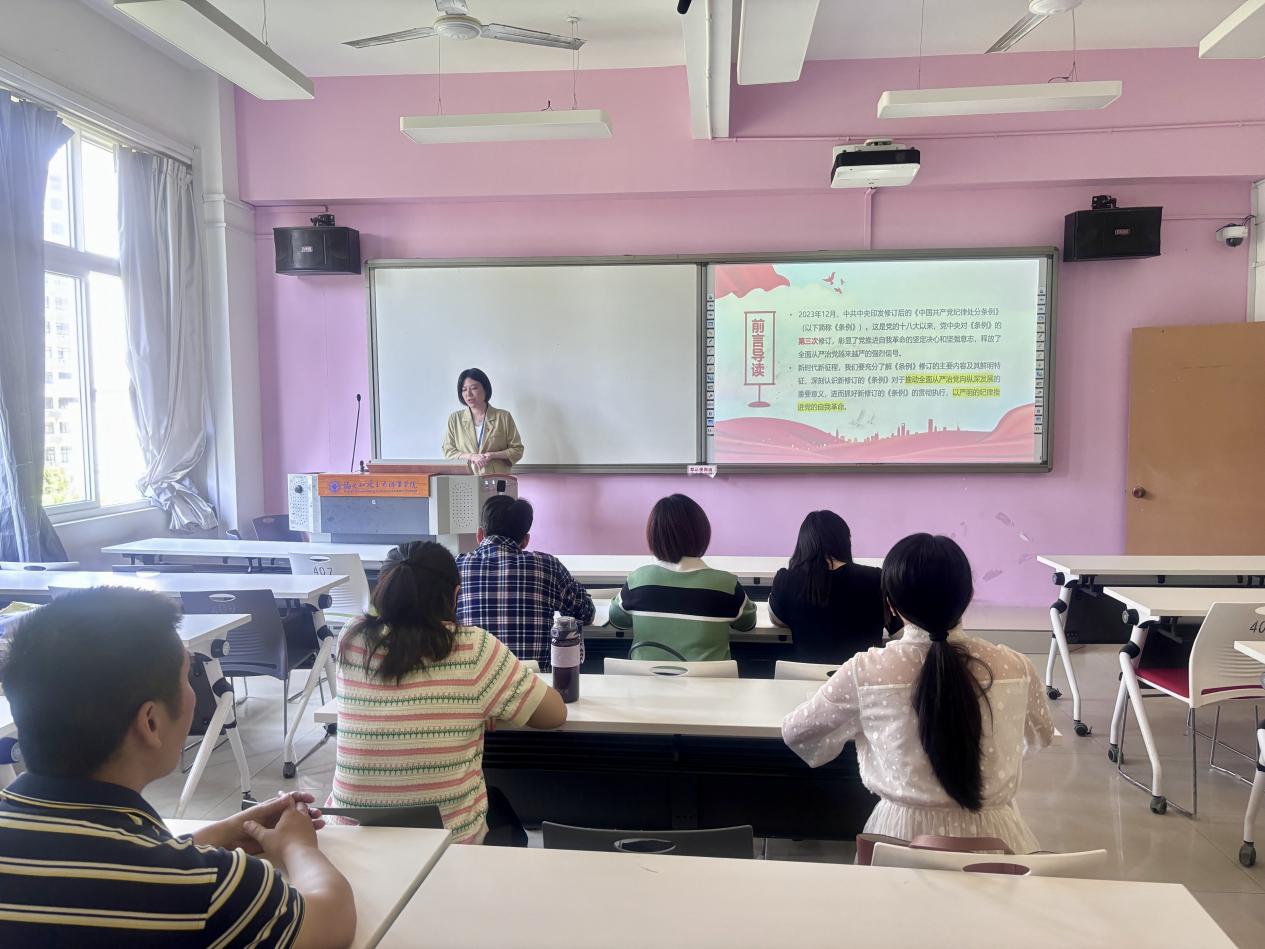 林穎同志圍繞新修訂的《中國共產(chǎn)黨紀(jì)律處分條例》(以下簡稱《條例》)背景與重要意義、《條例》的主要內(nèi)容、學(xué)習(xí)貫徹《條例》的要求、黨紀(jì)違規(guī)行為及案例分析四個(gè)方面展開。林穎同志還緊密圍繞高職院校的教育定位,并結(jié)合教師工作的實(shí)際情況,提出應(yīng)多方面深挖思政元素,并有機(jī)融入課程教學(xué)。她指出,作為黨員教師,必須堅(jiān)守教育的“底線”,切實(shí)擔(dān)當(dāng)起立德樹人的重任。