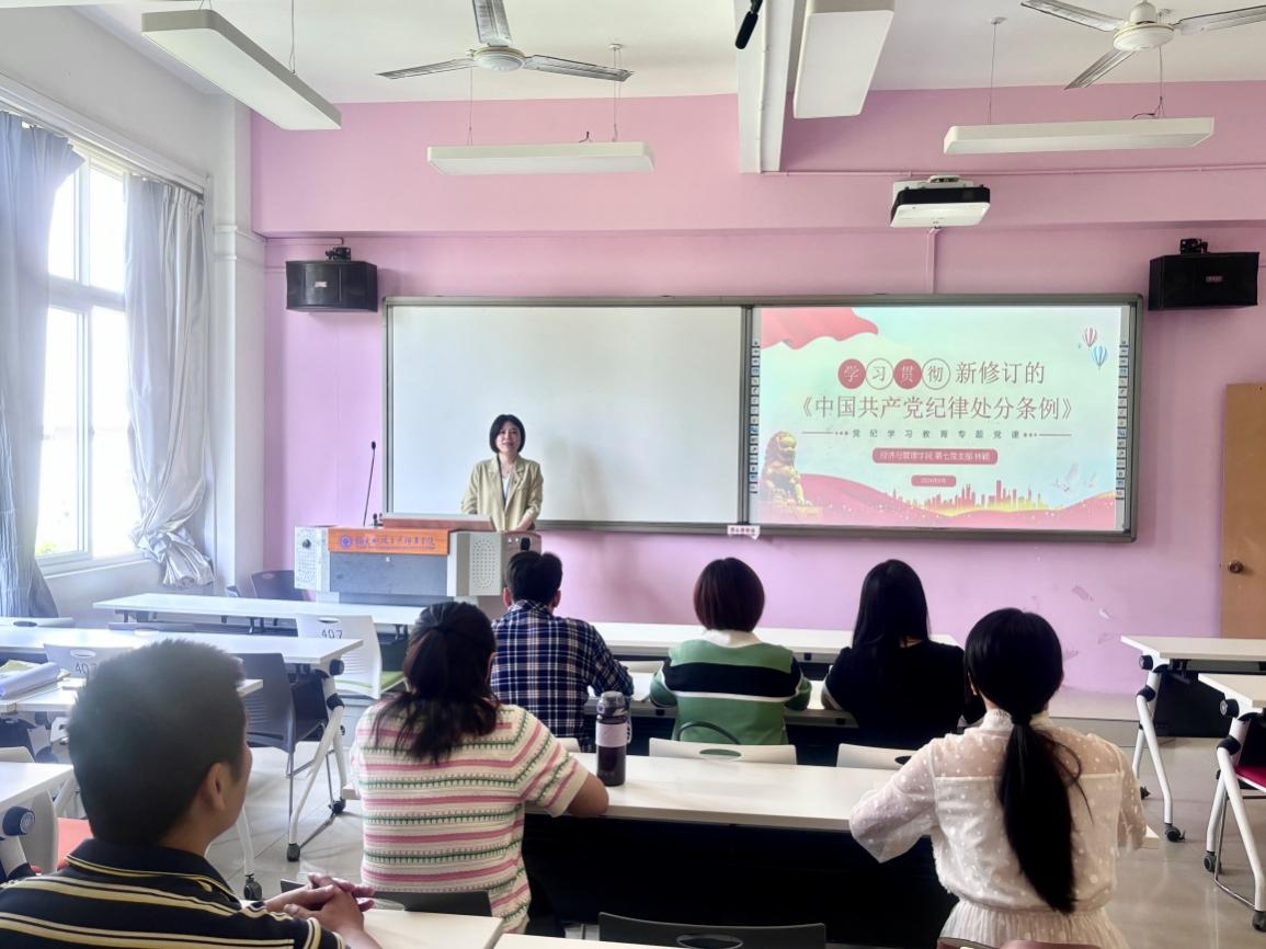 為扎實(shí)推進(jìn)黨紀(jì)學(xué)習(xí)教育走實(shí)走深,加強(qiáng)黨員教師的黨性教育和紀(jì)律教育,6月5日下午,經(jīng)濟(jì)與管理學(xué)院第七黨支部在求實(shí)樓409教室開展黨紀(jì)學(xué)習(xí)教育專題黨課,支部書記林穎同志以“嚴(yán)守黨規(guī)黨紀(jì),加強(qiáng)自我約束”為題,為支部講授專題黨課,支部全體黨員教師參加學(xué)習(xí)。