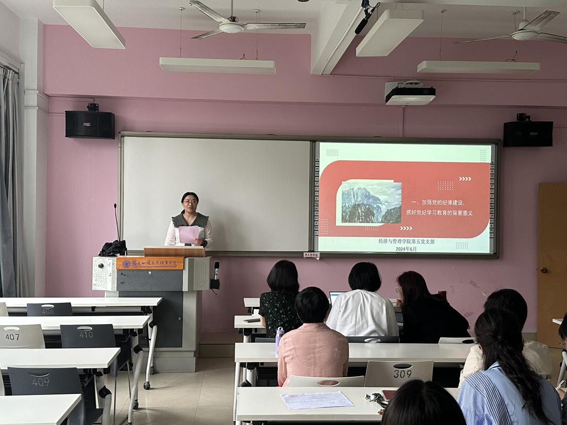為深入開展黨紀(jì)學(xué)習(xí)教育,引導(dǎo)黨員教師學(xué)紀(jì)、知紀(jì)、明紀(jì)、守紀(jì),進(jìn)一步推動(dòng)黨紀(jì)學(xué)習(xí)教育走深走實(shí),2024年6月5日,經(jīng)濟(jì)與管理學(xué)院第五黨支部舉辦“加強(qiáng)黨的紀(jì)律建設(shè)、抓好黨紀(jì)學(xué)習(xí)教育”專題黨課。本次黨課由支部書記林潔瑩授課,支部全體黨員參加了此次黨課。