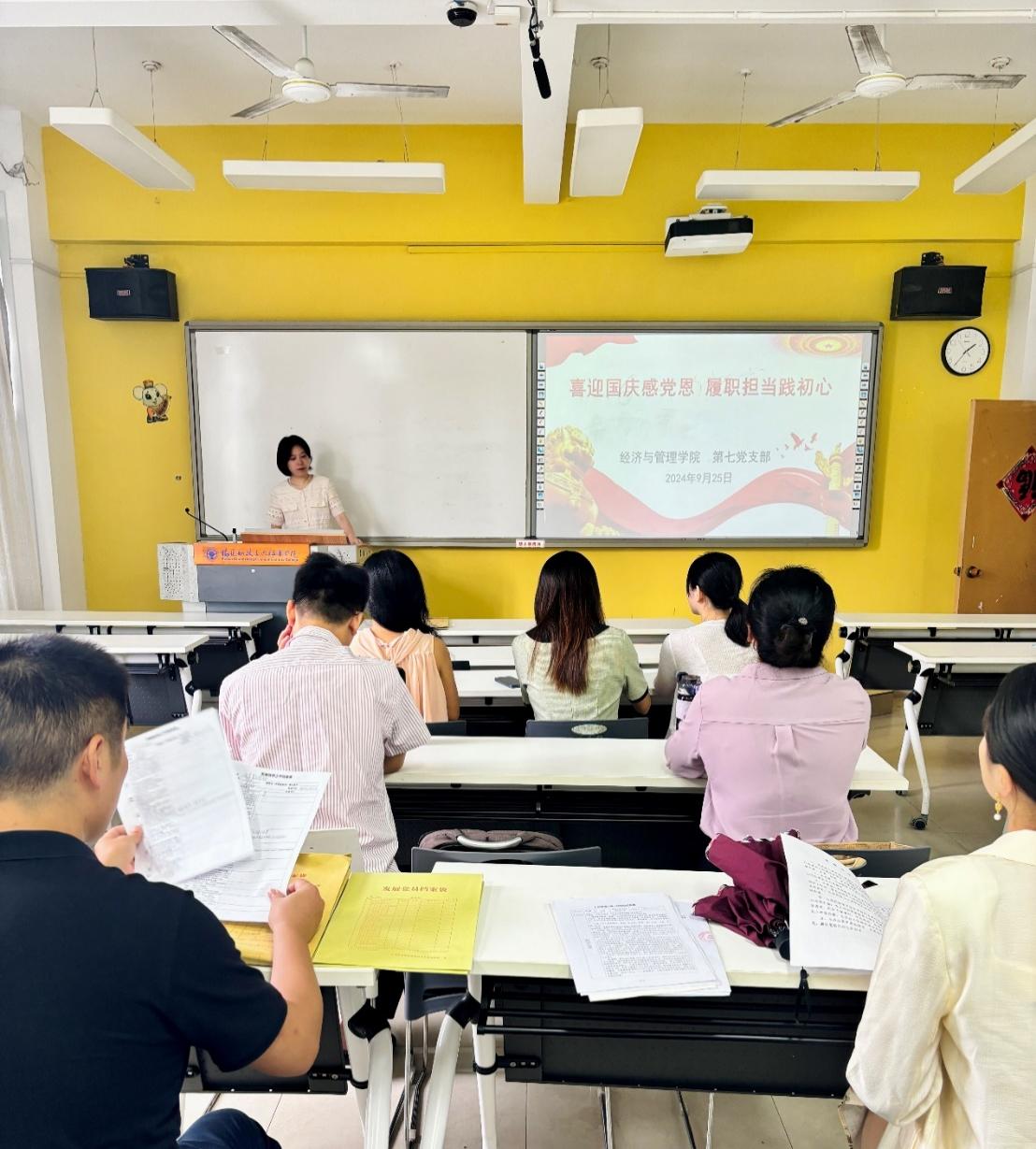 為慶祝中華人民共和國成立75周年,進(jìn)一步弘揚(yáng)愛國主義精神,引導(dǎo)黨員教師堅(jiān)定理想信念,忠誠盡職、奮勇爭先,近日,經(jīng)濟(jì)與管理學(xué)院第七黨支部開展“喜迎國慶感黨恩,履職擔(dān)當(dāng)踐初心”主題黨日活動(dòng)。