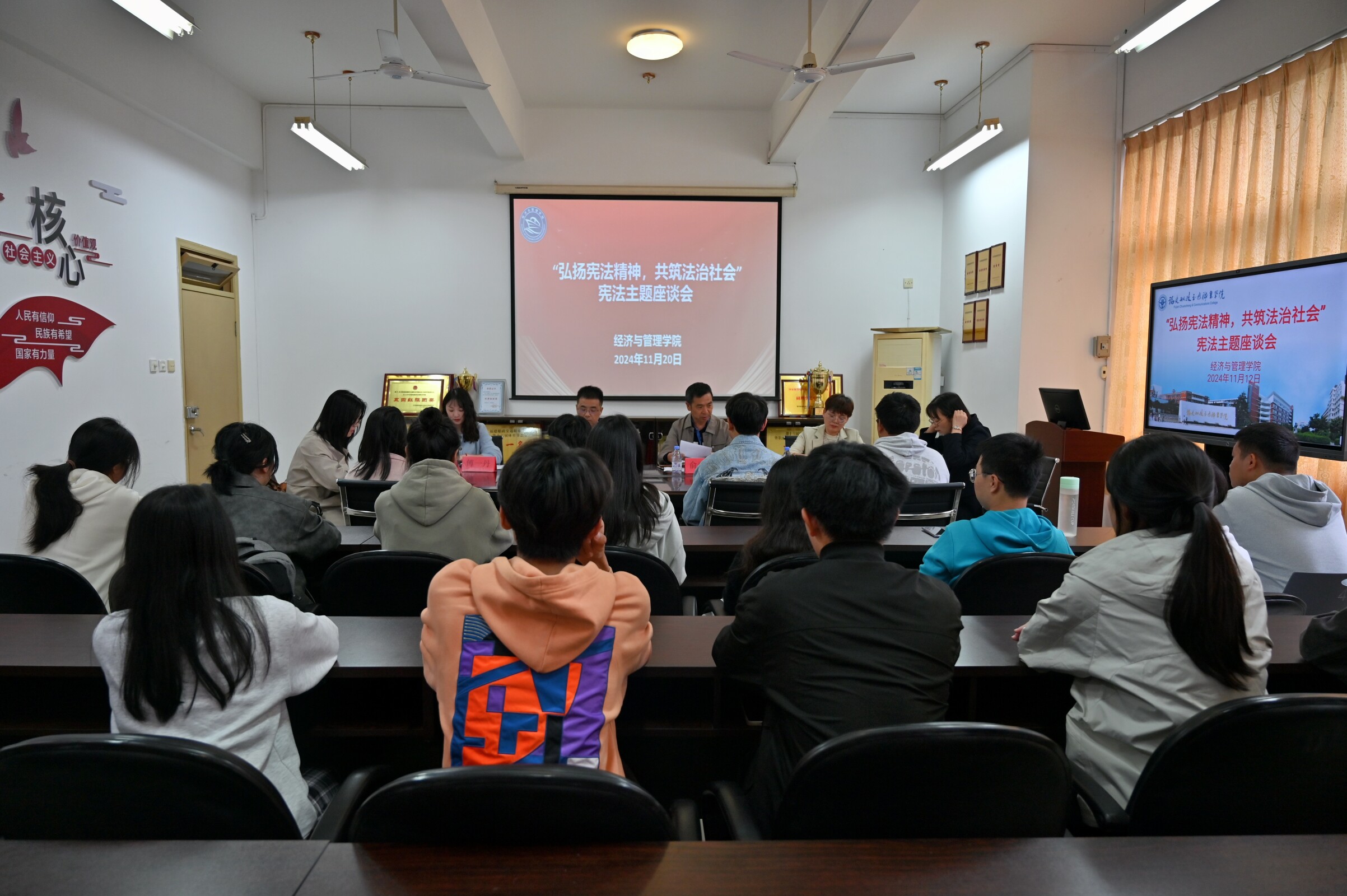 為深入貫徹習(xí)近平法治思想,經(jīng)濟(jì)與管理學(xué)院于2024年11月20日成功舉辦了“弘揚(yáng)憲法精神,共筑法治社會(huì)”憲法主題座談會(huì)。黨總支書(shū)記俞素平、院長(zhǎng)房曰榮、黨總支副書(shū)記林麗萍、團(tuán)委書(shū)記傅一丹及江瀟、王春英老師出席了本次活動(dòng)。