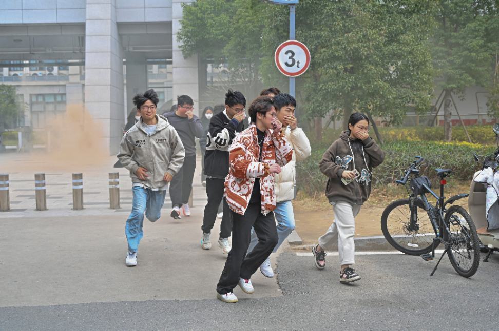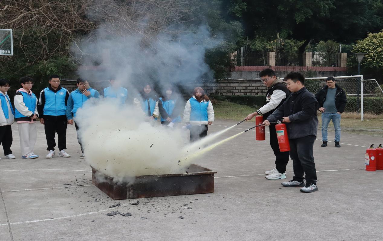 警報響起,學(xué)生們即刻按預(yù)案行動,領(lǐng)導(dǎo)與輔導(dǎo)員們指揮學(xué)生有序撤離。同學(xué)們鎮(zhèn)定自若,沿預(yù)定路線迅速離開教室。整個過程緊張而有序,無擁擠、摔倒情況,全體師生迅速安全抵達(dá)指定地點。接著,學(xué)生代表在籃球場觀摩學(xué)習(xí)滅火器使用,由院自律會成員演示“提、拔、握、壓”步驟,部分同學(xué)進(jìn)行了實操體驗。