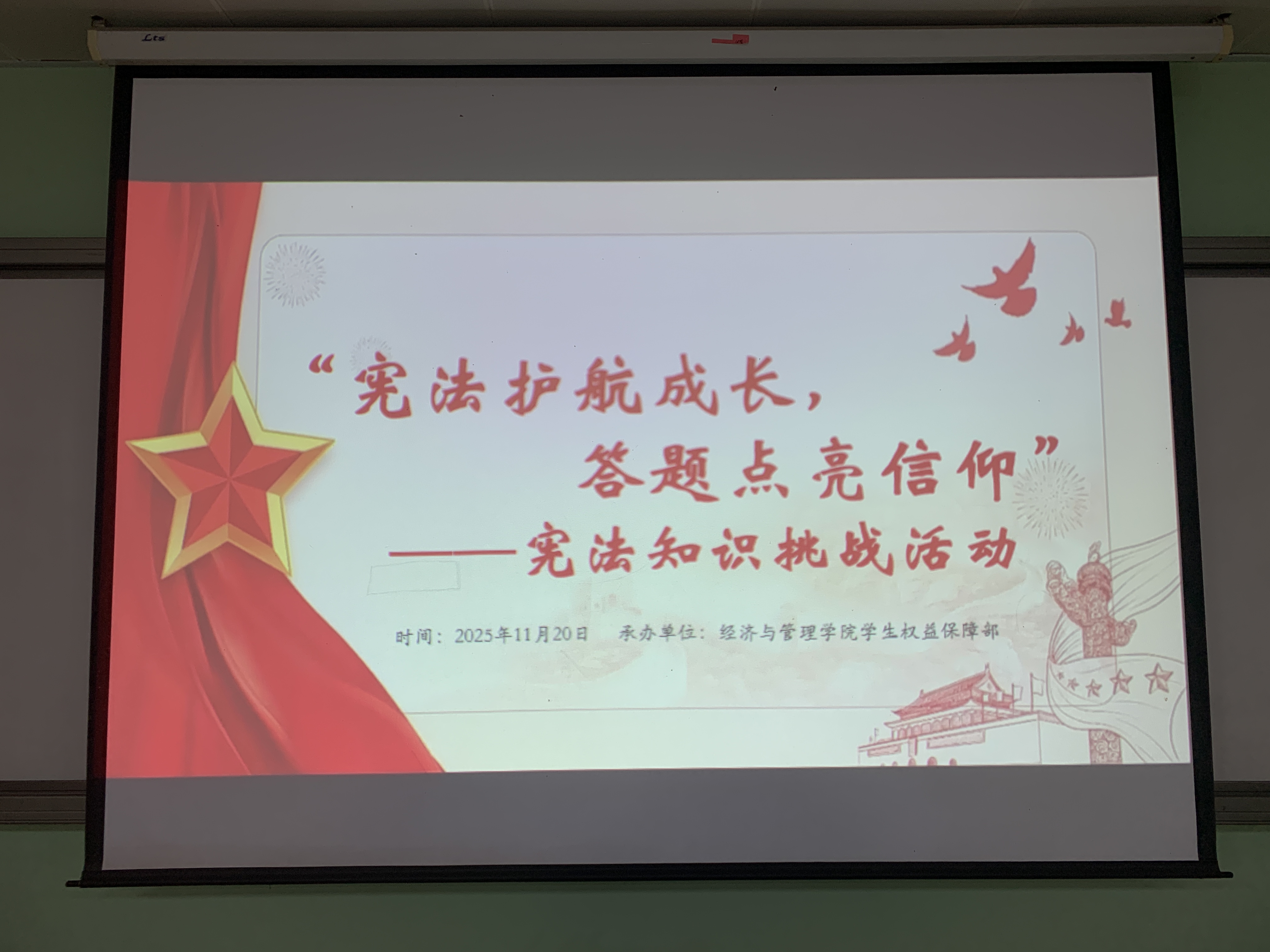 為深入學(xué)習(xí)貫徹習(xí)近平法治思想,弘揚(yáng)憲法精神,增強(qiáng)青年的憲法意識(shí)、法治觀念與素養(yǎng),引導(dǎo)其自覺(jué)尊法學(xué)法守法用法,讓法治力量護(hù)航青春成長(zhǎng),我院將于2025年12月4日16:00—17:00,在南區(qū)經(jīng)管樓407舉辦“憲法護(hù)航成長(zhǎng),答題點(diǎn)亮信仰”憲法知識(shí)挑戰(zhàn)活動(dòng)。