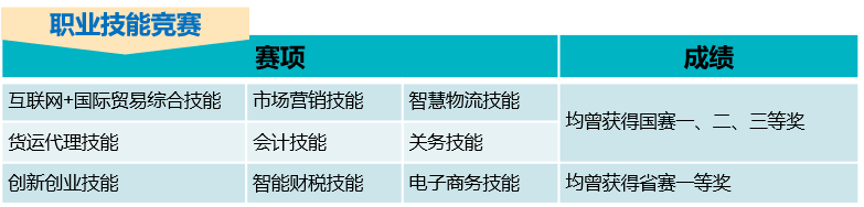 專業(yè)群資源庫(kù)建設(shè)聯(lián)盟啟動(dòng)儀式 以賽促學(xué) 激發(fā)創(chuàng)新潛力 重視雙創(chuàng)教育和學(xué)生技能競(jìng)賽,累計(jì)獲得全國(guó)“互聯(lián)網(wǎng)+”大學(xué)生創(chuàng)新創(chuàng)業(yè)大賽銅獎(jiǎng)1項(xiàng),“挑戰(zhàn)杯”中國(guó)大學(xué)生創(chuàng)業(yè)計(jì)劃競(jìng)賽國(guó)賽銀獎(jiǎng)1項(xiàng),福建省“互聯(lián)網(wǎng)+”大學(xué)生創(chuàng)新創(chuàng)業(yè)大賽金獎(jiǎng)1項(xiàng)、銀獎(jiǎng)4項(xiàng)、銅獎(jiǎng)4項(xiàng),“互聯(lián)網(wǎng)+交通”全國(guó)職業(yè)院校大學(xué)生創(chuàng)新創(chuàng)業(yè)大賽銅獎(jiǎng)1項(xiàng),福建省青年創(chuàng)新創(chuàng)業(yè)大賽二等獎(jiǎng)1項(xiàng),挑戰(zhàn)杯創(chuàng)新創(chuàng)業(yè)省賽金獎(jiǎng)1項(xiàng)、銅獎(jiǎng)1項(xiàng)。在全國(guó)職業(yè)技能競(jìng)賽中,互聯(lián)網(wǎng)+國(guó)際貿(mào)易綜合技能、關(guān)務(wù)技能、智慧物流技能、會(huì)計(jì)技能、市場(chǎng)營(yíng)銷技能、貨運(yùn)代理技能賽項(xiàng)曾獲得國(guó)家級(jí)一、二、三等獎(jiǎng)。智能財(cái)稅技能、電子商務(wù)技能、創(chuàng)新創(chuàng)業(yè)技能賽項(xiàng)均曾獲省賽一等獎(jiǎng)。