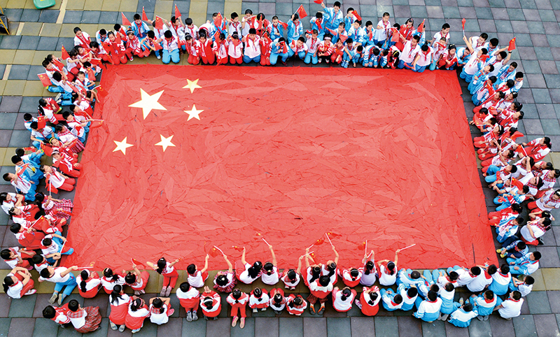 社會(huì)主義辦學(xué)方向是我國(guó)教育最鮮亮的底色,我國(guó)教育要培養(yǎng)的是社會(huì)主義建設(shè)者和接班人,這是個(gè)根本性的問題。圖為山東省沂源縣荊山路小學(xué)開展“紅領(lǐng)巾拼國(guó)旗祝福祖國(guó)迎國(guó)慶”活動(dòng),學(xué)生們?cè)诶蠋煄ьI(lǐng)下用紅領(lǐng)巾拼出了一面巨型國(guó)旗,表達(dá)對(duì)偉大祖國(guó)的祝福。(教育部供圖)