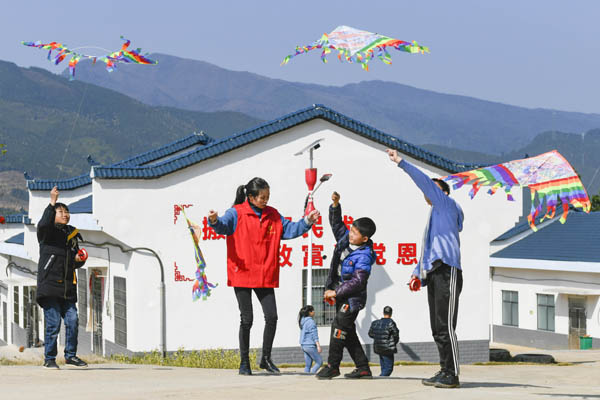 黨的十八大以來,我們黨把脫貧攻堅擺在治國理政的突出位置,組織開展了聲勢浩大的脫貧攻堅人民戰(zhàn)爭。數(shù)百萬扶貧干部傾力奉獻(xiàn)、苦干實干,同貧困群眾想在一起、過在一起、干在一起,使脫貧地區(qū)整體面貌發(fā)生歷史性巨變。圖為近日,在湖南省永州市道縣橫嶺瑤族鄉(xiāng)浪石村易地扶貧搬遷安置區(qū),孩子們開心地放風(fēng)箏。(圖片來源:視覺中國)