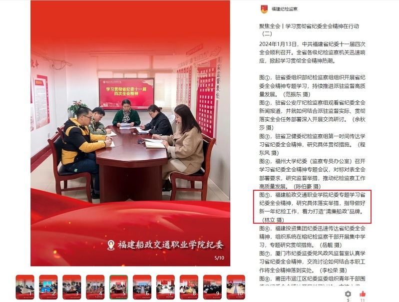 2024年1月17日,福建省紀(jì)委監(jiān)委官網(wǎng)、福建紀(jì)檢監(jiān)察微信公眾號(hào)報(bào)道學(xué)院紀(jì)委專題學(xué)習(xí)省紀(jì)委十一屆四次全會(huì)精神,內(nèi)容如下: