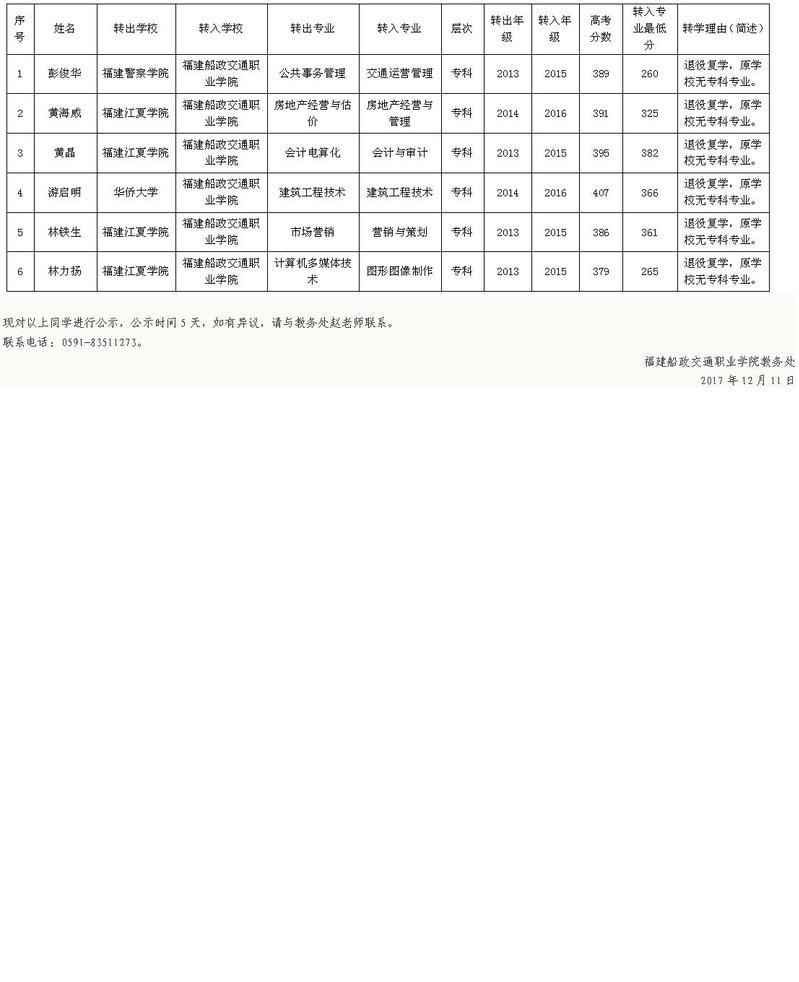 根據(jù)《福建省教育廳關(guān)于做好普通高等學校學生轉(zhuǎn)學備案工作的通知》(閩教學〔2017〕46號)文件的相關(guān)規(guī)定,經(jīng)學生本人申請、教務(wù)處審核并經(jīng)學校集體會議研究決定,同意彭俊華等六位同學轉(zhuǎn)學申請。轉(zhuǎn)學學生具體信息如下: