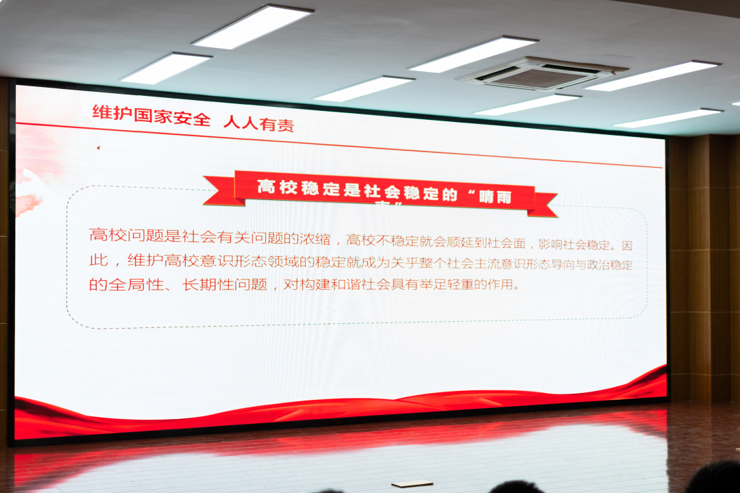 褚紅云副教授作為福建省公安廳國內(nèi)安全保衛(wèi)教育訓(xùn)練基地主任、福建省法學(xué)會國家安全法學(xué)研究會理事、公安部國內(nèi)安全保衛(wèi)局特聘教官,具有扎實的理論積淀和豐富的辦案經(jīng)驗。她從維護國家安全人人有責(zé)這個大格局中,選取了高校安全和國家安全這個小視角進行剖析解讀?!案咝7€(wěn)定是社會穩(wěn)定的晴雨表”,褚教授通過發(fā)生在校園中,發(fā)生在高校學(xué)者、青年學(xué)生身上的境外滲透、宗教活動、互聯(lián)網(wǎng)犯罪等真實案例,具象生動的闡釋了高校中存在的國家安全風(fēng)險、兩者之間的關(guān)系及高校的應(yīng)對建議。引導(dǎo)船政學(xué)子將愛國熱情轉(zhuǎn)換為愛國智慧,將報國情懷踐行為報國行動,為守衛(wèi)國家的長治久安,維護校園的安定穩(wěn)定貢獻青年學(xué)子的智慧和力量。