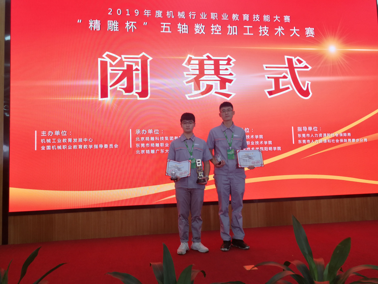 2019年度全國機械行業(yè)職業(yè)教育技能大賽——“精雕杯”五軸數(shù)控加工技術(shù)的比賽于10月31日至11月2日在廣東東莞舉行,我院學(xué)生吳仲川、魏再煌組成的代表隊榮獲全國第二名暨一等獎,指導(dǎo)教師李云妹、謝祖華被評為“優(yōu)秀指導(dǎo)教師”,吳仲川、魏再煌兩位同學(xué)憑借嫻熟的技能和優(yōu)異的表現(xiàn)直接被北京精雕科技集團有限公司錄用,畢業(yè)后可直接前往北京辦理入職手續(xù)。