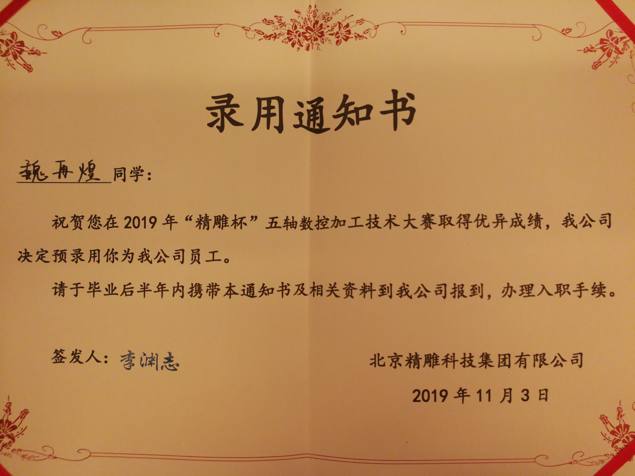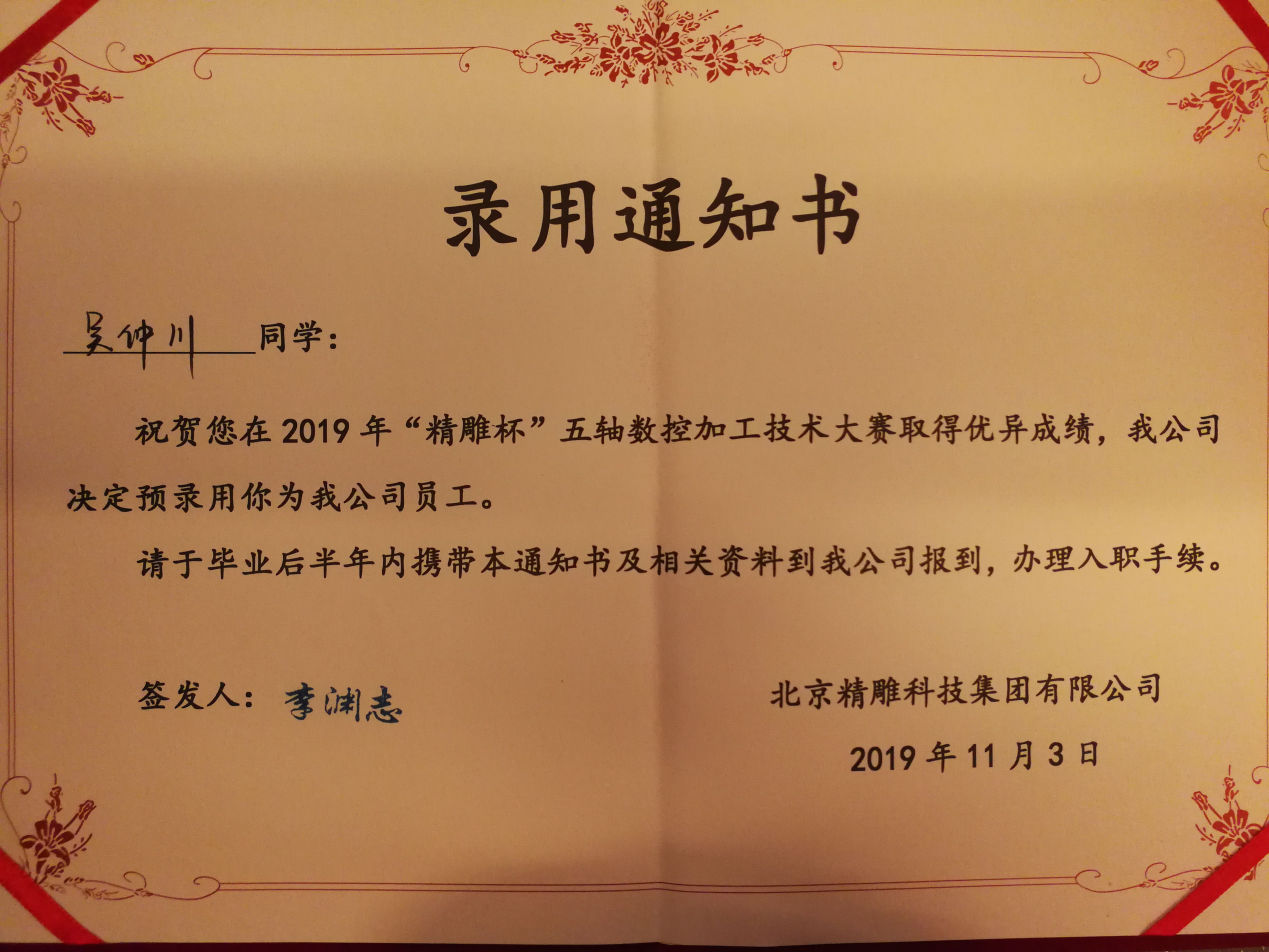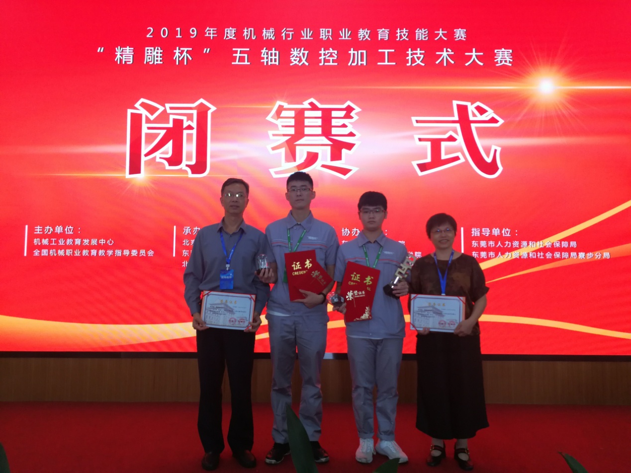 2019年度全國機(jī)械行業(yè)職業(yè)教育技能大賽——“精雕杯”五軸數(shù)控加工技術(shù)的比賽于10月31日至11月2日在廣東東莞舉行,我院學(xué)生吳仲川、魏再煌組成的代表隊(duì)榮獲全國第二名暨一等獎,指導(dǎo)教師李云妹、謝祖華被評為“優(yōu)秀指導(dǎo)教師”,吳仲川、魏再煌兩位同學(xué)憑借嫻熟的技能和優(yōu)異的表現(xiàn)直接被北京精雕科技集團(tuán)有限公司錄用,畢業(yè)后可直接前往北京辦理入職手續(xù)。