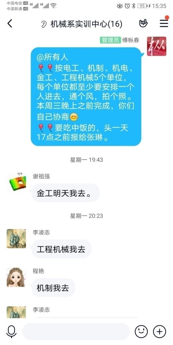 疫情發(fā)生后,機(jī)械工程系迅速成立防控新冠肺炎疫情工作領(lǐng)導(dǎo)小組,實(shí)訓(xùn)中心傅樅春主任、李凌志副主任作為小組成員投入?yún)f(xié)調(diào)宣傳組、防控保障組、學(xué)生工作組、教職工工作組等各個分組的工作中。參與系部組織的歷次新冠疫情防控工作會議,及時向老師傳達(dá)新型冠狀病毒感染的肺炎防控知識,提高自我保護(hù)能力。系實(shí)訓(xùn)中心有三分之二的老師同時兼任學(xué)生班主任,他們落實(shí)落細(xì)學(xué)生健康管理措施,健全完善“網(wǎng)格化”“單元化”“人盯人”跟蹤管理臺賬,及時聯(lián)絡(luò)學(xué)生,全面準(zhǔn)確掌握學(xué)生健康狀況和動態(tài),重點(diǎn)關(guān)注學(xué)生是否有發(fā)熱、疑似或感染疫情情況,督促檢查學(xué)生按時在Welink健康打卡,關(guān)注學(xué)生的心理動態(tài),并對學(xué)生進(jìn)行適當(dāng)安撫、心理咨詢和輔導(dǎo)。