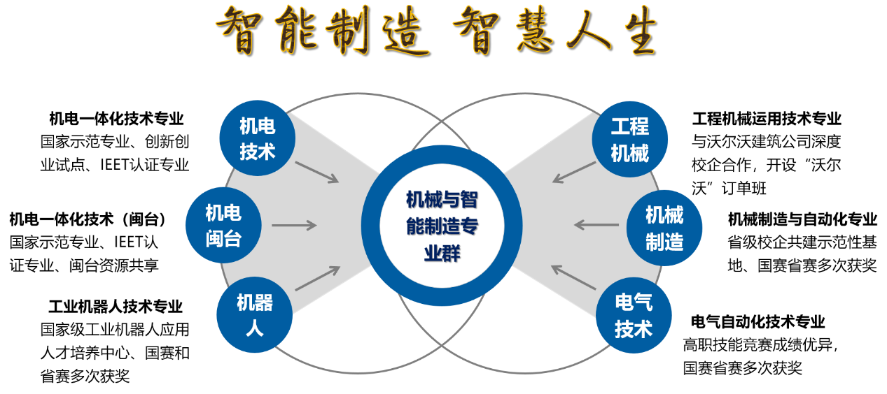 機械與智能制造專業(yè)群主要由機電一體化技術(shù)、工業(yè)機器人技術(shù)、電氣自動化技術(shù)、機械制造與自動化技術(shù)和工程機械運用技術(shù)等5個專業(yè)組成。面向先進制造業(yè)的數(shù)字化設計、智能化生產(chǎn)、智慧化服務、工程機械運用等領(lǐng)域用人單位,以立德樹人為根本,突出工業(yè)產(chǎn)品生命全周期管理意識;培養(yǎng)具備數(shù)字化設計,智能制造,生產(chǎn)質(zhì)量品控,機電設備安裝,智能控制,成套機電設備調(diào)試,智慧電氣監(jiān)控、工程機械運用與維修等復合能力,具有可持續(xù)發(fā)展能力的智能產(chǎn)線工藝設計員、機電控制系統(tǒng)設計員、產(chǎn)品三維創(chuàng)新設計員、機械制造工藝設計員、工業(yè)機器人控制技術(shù)員、機電設備運行技術(shù)員 、智能產(chǎn)線操作技術(shù)員 、自動加工島操作技術(shù)員 、精密測量與檢測技術(shù)員、自動化系統(tǒng)維護技術(shù)員、工業(yè)機器人維護技術(shù)員、智慧電氣系統(tǒng)維護技術(shù)員、機電設備營銷服務專員、云平臺管理人員、工程機械維修維護和操作人員等高端技術(shù)技能人才,為制造強國和區(qū)域經(jīng)濟社會發(fā)展提供優(yōu)質(zhì)人才資源支撐。