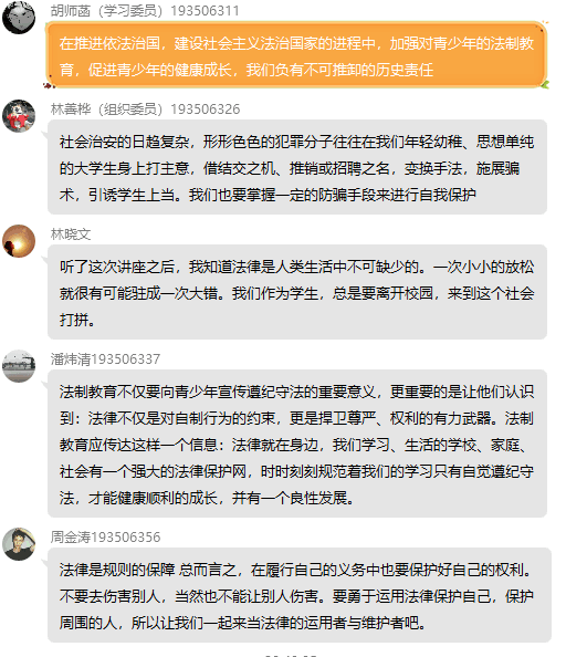 在這里不禁有同學(xué)會(huì)問(wèn):此次法治宣講用處有多大呢?在高速發(fā)展的信息時(shí)代,騙子的手段也在與時(shí)俱進(jìn),劉警官的此次宣講貼近我們現(xiàn)在的生活,是我們可能會(huì)遇到的情況,讓我們對(duì)社會(huì)上形形色色的案件更加的了解。這些看似簡(jiǎn)簡(jiǎn)單單的話語(yǔ),蘊(yùn)含的都是實(shí)實(shí)在在的法律知識(shí),當(dāng)遇到我們無(wú)法處理的事情時(shí),最重要的就是要保護(hù)好自己,及時(shí)尋求法律的幫助。