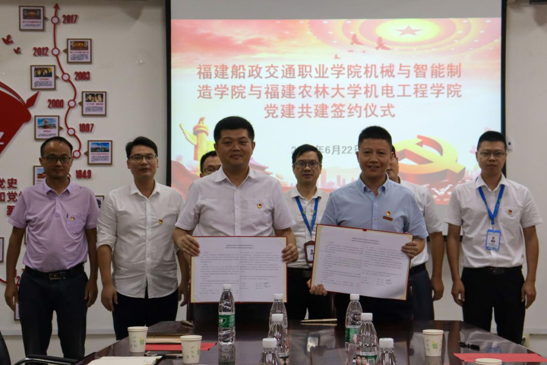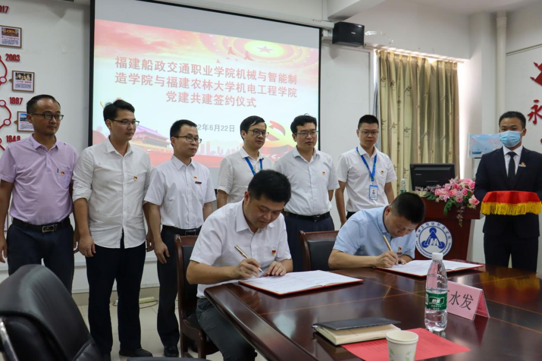 為進(jìn)一步提高我院基層黨組織凝聚力、戰(zhàn)斗力,不斷推動(dòng)我院的建設(shè)和發(fā)展,努力構(gòu)建“資源共享、優(yōu)勢(shì)互補(bǔ)、互相促進(jìn)、共同提高”的黨建工作新格局。2022年6月22日,福建船政交通職業(yè)學(xué)院機(jī)械與智能制造學(xué)院與福建農(nóng)林大學(xué)機(jī)電工程學(xué)院舉行黨建共建簽約儀式。