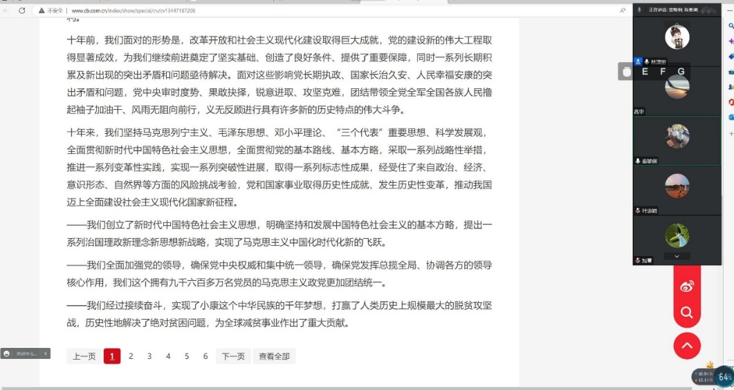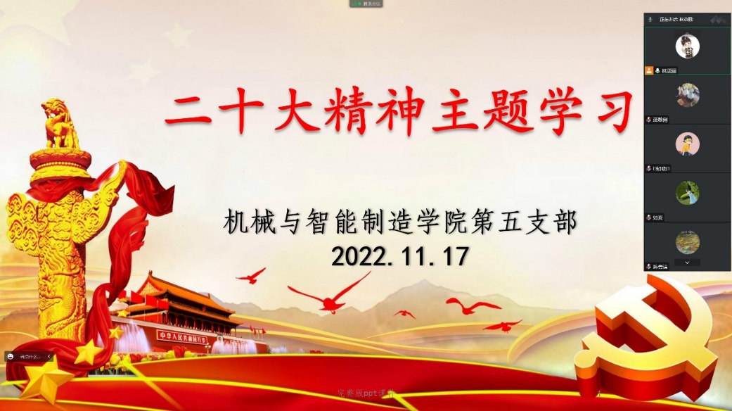11月17日,機(jī)械與智能制造學(xué)院第五支部利用騰訊會(huì)議,組織黨員深入學(xué)習(xí)黨的二十大精神。通過黨員讀報(bào)告、談感想等多種形式,進(jìn)一步領(lǐng)會(huì)黨的二十大精神,深刻認(rèn)識(shí)自己肩負(fù)的歷史使命和時(shí)代責(zé)任。