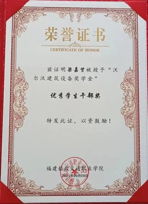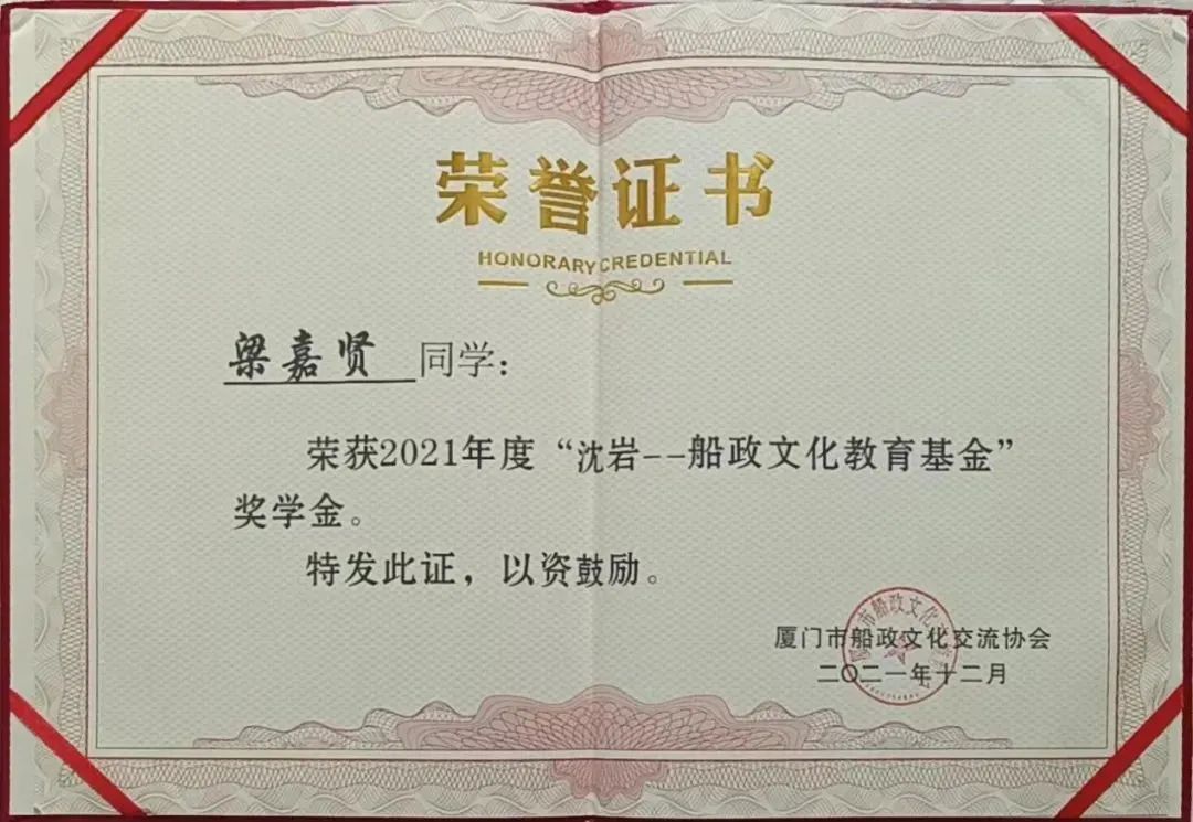 2、2021-2022年度,福建船政交通職業(yè)學(xué)院“一等獎學(xué)金”;