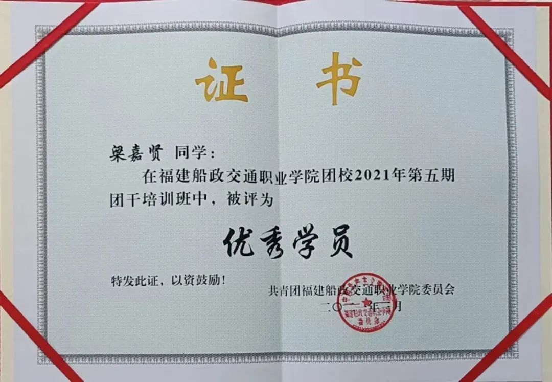 10、福建船政交通職業(yè)學(xué)院團校2021年第五期團干培訓(xùn)班“優(yōu)秀學(xué)員”;