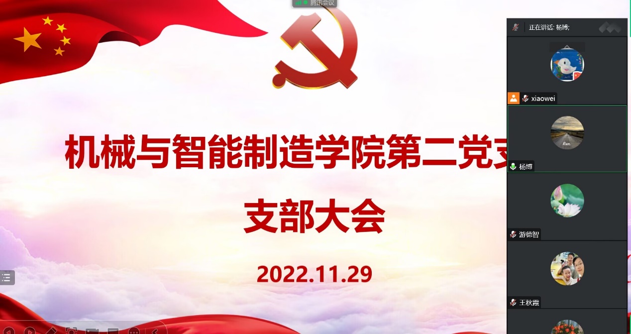 2022年11月29日,機(jī)械與智能制造學(xué)院第二黨支部在線上召開支部學(xué)習(xí)大會,學(xué)習(xí)《習(xí)近平:在二十屆中央政治局常委同中外記者見面時(shí)的講話》、《中國共產(chǎn)黨章程》(中國共產(chǎn)黨第二十次全國代表大會部分修改,2022年10月22日通過)、《孫春蘭:辦好人民滿意的教育》、《省委常委會召開會議認(rèn)真學(xué)習(xí)貫徹習(xí)近平總書記重要講話重要指示精神 周祖翼主持并研究貫徹落實(shí)措施》等文件精神。