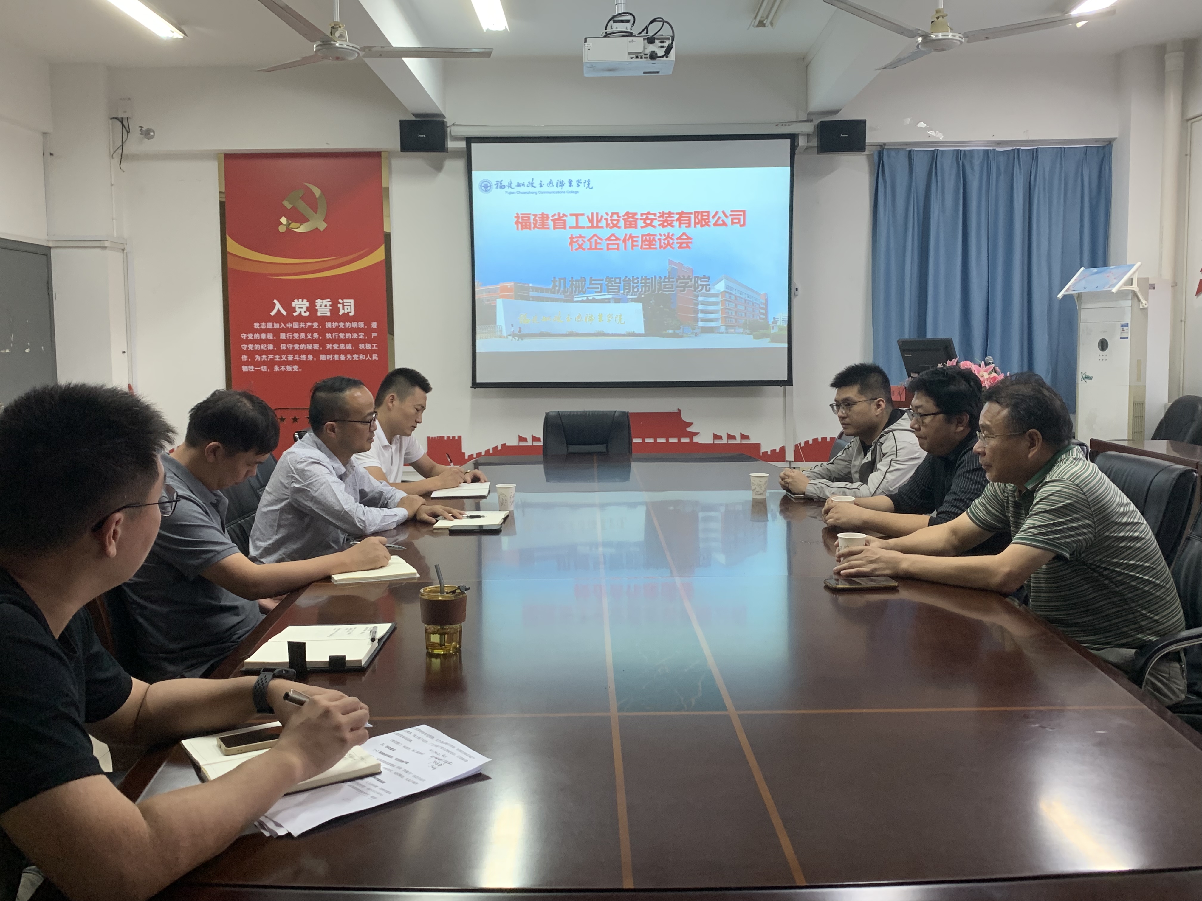 陳貴清教授代表機械與智能制造學院對趙主任一行的到來表示熱烈歡迎,簡要介紹了學院的發(fā)展歷程、專業(yè)建設、人才培養(yǎng)、科技服務、技能競賽和實驗室建設等情況。表示我院的教育立足于“工匠精神”,將理論知識與動手實踐融于教學過程,致力于高素質(zhì)技術(shù)技能型人才的培養(yǎng)。同時,我院有著豐富的校企合作經(jīng)驗,希望能與來訪的福建省工業(yè)設備安裝有限公司開展多方面的合作。