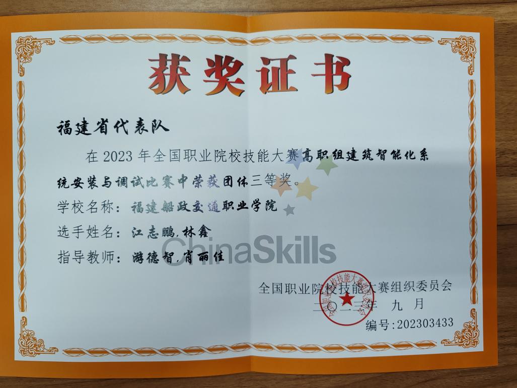 2023年9月17日--9月21日,全國職業(yè)院校技能大賽“建筑智能化系統(tǒng)安裝與調(diào)試”賽項(xiàng)在黑龍江建筑職業(yè)技術(shù)學(xué)院舉行,來自全國29個(gè)省、自治區(qū)、直轄市的65所參賽學(xué)校的300多名參賽選手參賽。經(jīng)過緊張激烈的比賽,支部黨員游德智老師和另一位教師肖麗佳老師指導(dǎo)的江志鵬、林鑫同學(xué)獲得學(xué)生賽團(tuán)體三等獎(jiǎng)。