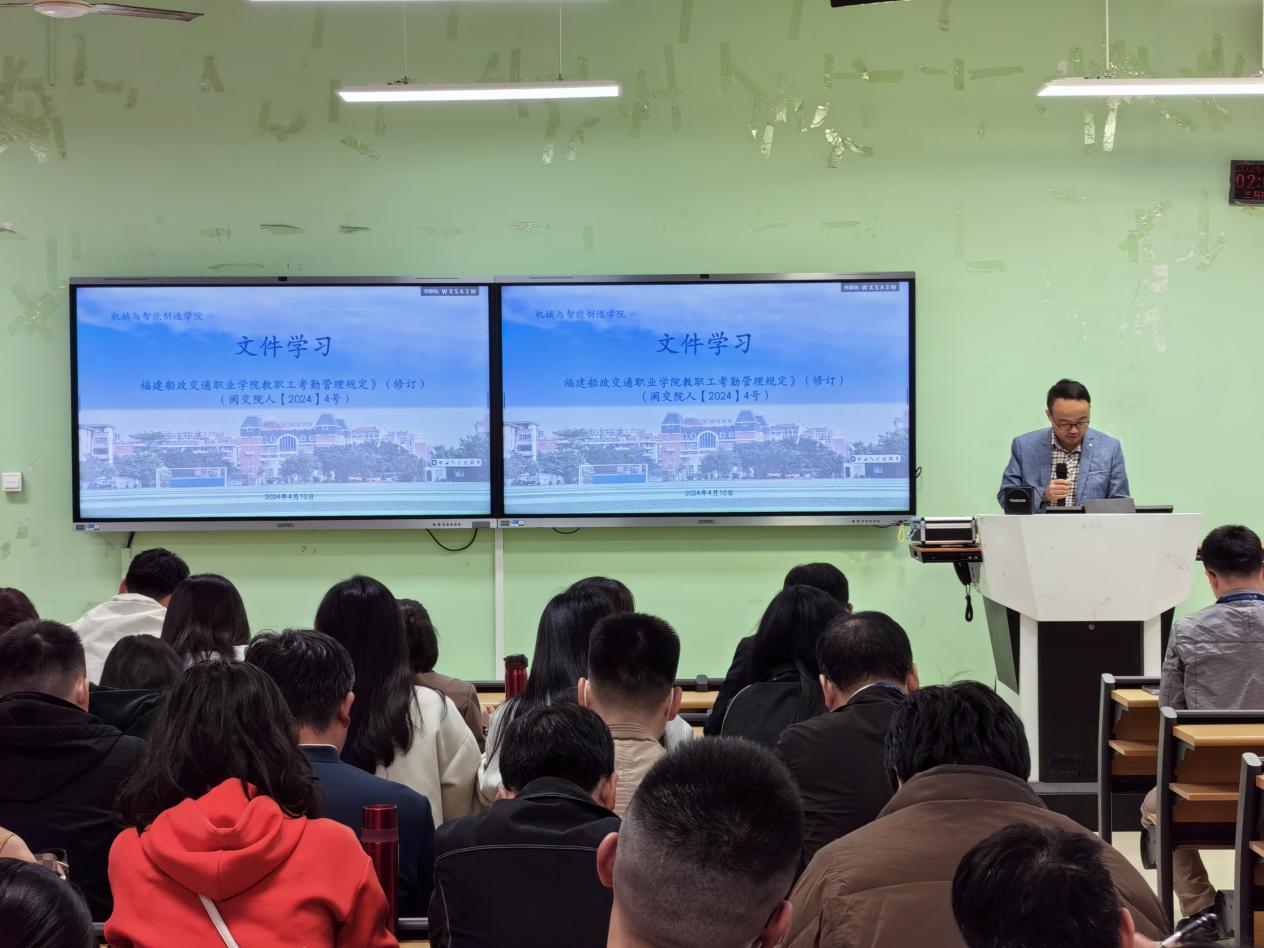 為保障學(xué)校各方面工作的正常運(yùn)轉(zhuǎn),建立正常有序的教學(xué)秩序,促進(jìn)學(xué)校教育教學(xué)工作的持續(xù)發(fā)展,進(jìn)一步完善對(duì)教師實(shí)施教學(xué)常規(guī)情況的檢查與管理,使全體教師自覺按學(xué)校管理目標(biāo)規(guī)范自己的教育教學(xué)行為,提高教師工作的積極性、主動(dòng)性,4月10日機(jī)械與智能制造學(xué)院教職工例會(huì)專題學(xué)習(xí)了《福建船政交通職業(yè)學(xué)院教職工考勤管理規(guī)定》(修訂)》(閩交院人【2024】4號(hào))。