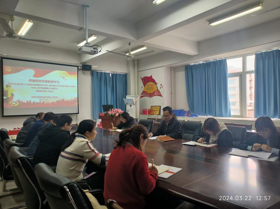為加強(qiáng)師德師風(fēng)建設(shè)工作,嚴(yán)肅學(xué)院教師隊(duì)伍工作紀(jì)律,規(guī)范教師行為,教育和引導(dǎo)教職工敬畏法規(guī)、踐行法規(guī),依法依紀(jì)辦事,3月22日,機(jī)械與智能制造學(xué)院第二黨支部全體黨員專(zhuān)題學(xué)習(xí)了《事業(yè)單位工作人員處分規(guī)定》、《中華人民共和國(guó)愛(ài)國(guó)主義教育法》和中國(guó)教育部中國(guó)教育報(bào)關(guān)于《做好教書(shū)育人大先生》的報(bào)道,會(huì)議由第二黨支部書(shū)記楊開(kāi)懷主持。