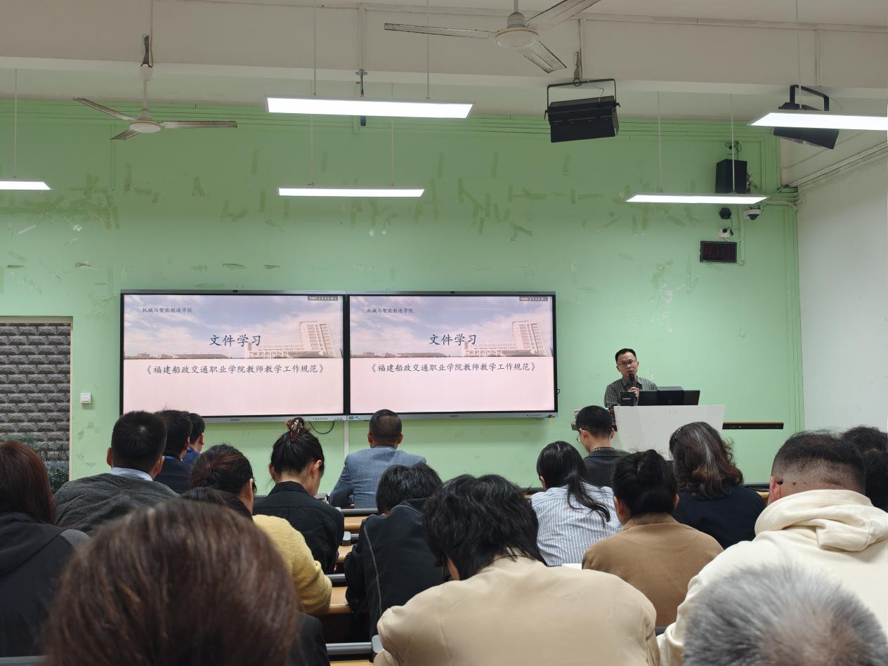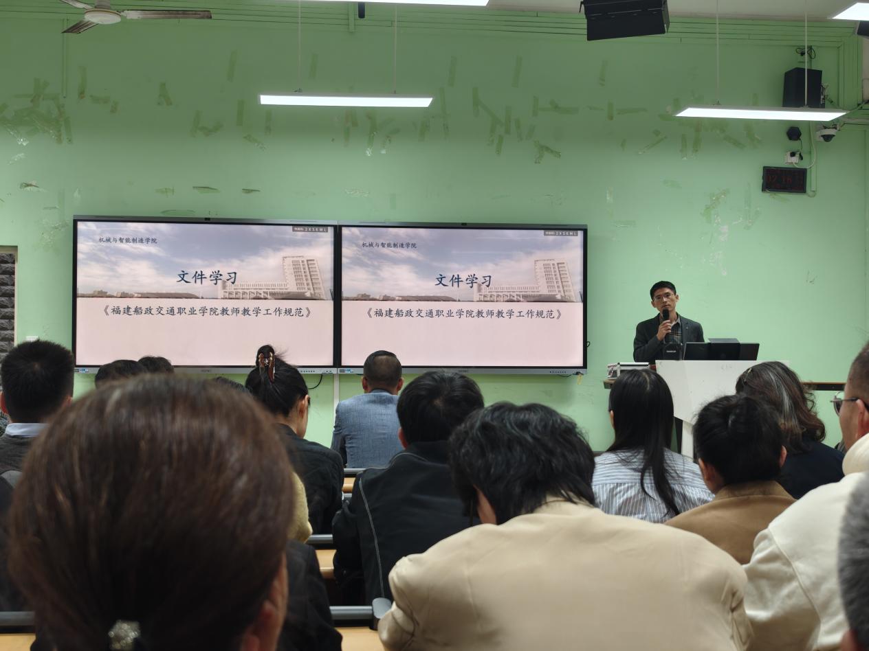 2024年11月13日,機械與智能制造學(xué)院組織全體教職工學(xué)習(xí)《福建船政交通職業(yè)學(xué)院教師教學(xué)工作規(guī)范》。曾思通副院長帶領(lǐng)全體教職工學(xué)習(xí)文件,共同學(xué)習(xí)文件中規(guī)定的教師教學(xué)要做好教學(xué)準備,包括培養(yǎng)方案,授課計劃,要做好課堂教學(xué),對各教學(xué)環(huán)節(jié)時間應(yīng)分配恰當(dāng),融“教、學(xué)、做”為一體,鼓勵學(xué)生獨立思考,激發(fā)學(xué)生的主動性。他強調(diào),教師在人才培養(yǎng)過程中起主導(dǎo)作用,要求全體教師提高政治思想水平、業(yè)務(wù)能力和教學(xué)水平,規(guī)范工作,增強工作責(zé)任心,不斷提高教學(xué)質(zhì)量,培養(yǎng)合格人才。