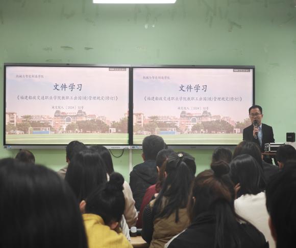 為提升學(xué)院教職工出國(guó)(境)管理的規(guī)范化水平,保障教育教學(xué)、科研和管理工作的正常秩序,機(jī)械與智能制造學(xué)院于2024年12月4日下午組織全體教職工深入學(xué)習(xí)了新修訂的《福建船政交通職業(yè)學(xué)院教職工出國(guó)(境)管理規(guī)定(修訂)》(閩交院人[2024]32號(hào))。學(xué)習(xí)會(huì)議由楊開(kāi)懷院長(zhǎng)主持,陳貴清副院長(zhǎng)領(lǐng)學(xué)。