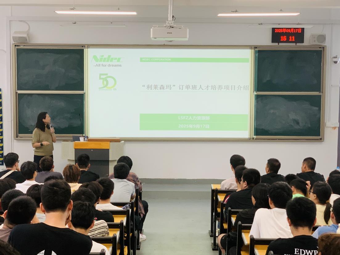 訂單班合作企業(yè)-利萊森瑪電機(jī)科技(福州)有限公司企業(yè)人事經(jīng)理代表企業(yè)上臺(tái)發(fā)言。其先是介紹了企業(yè)的發(fā)展歷程、行業(yè)地位與核心業(yè)務(wù),讓新生對(duì)合作企業(yè)有了全面了解;接著,重點(diǎn)解讀了電氣專業(yè)訂單班的培養(yǎng)體系,包括“校企共同制定人才培養(yǎng)方案”“學(xué)生進(jìn)入企業(yè)實(shí)習(xí)實(shí)訓(xùn)”等特色環(huán)節(jié),清晰展現(xiàn)了訂單班“工學(xué)結(jié)合、精準(zhǔn)育人”的優(yōu)勢(shì),為新生提供了一條“入學(xué)即接軌職場(chǎng)”的成長通道。
