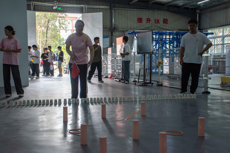 工業(yè)機(jī)器人實(shí)訓(xùn)車間內(nèi),貼滿治愈系情緒文案的紙杯,如七彩彩虹般錯落排列,將工業(yè)風(fēng)的車間暈染出節(jié)日的柔軟。學(xué)子們手持彩色套圈,凝神佇立在指定線前,目光鎖定目標(biāo)——從“簡單”的近距挑戰(zhàn)到“困難”的遠(yuǎn)距博弈,每一次抬手、投擲,都牽動著現(xiàn)場的歡呼。套中的瞬間,清脆笑聲與熱烈掌聲撞個滿懷,手中的“暖心寄語”卡片,字里行間滿是節(jié)日的溫柔。更有幸運(yùn)兒在“困難”難度下三戰(zhàn)三捷,將吉祥物“機(jī)小智”抱入懷中。指尖的精準(zhǔn)里藏著青春的韌勁,歡騰的氛圍中映著“少年強(qiáng)則國強(qiáng)”的赤誠,這是屬于船政學(xué)子的國慶快樂記憶。