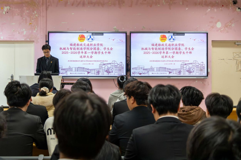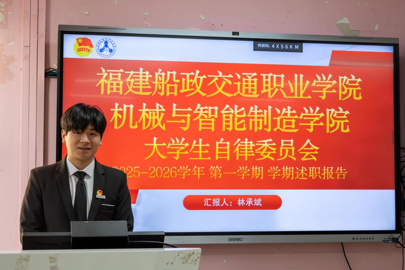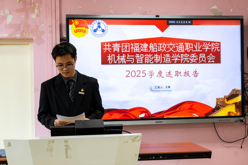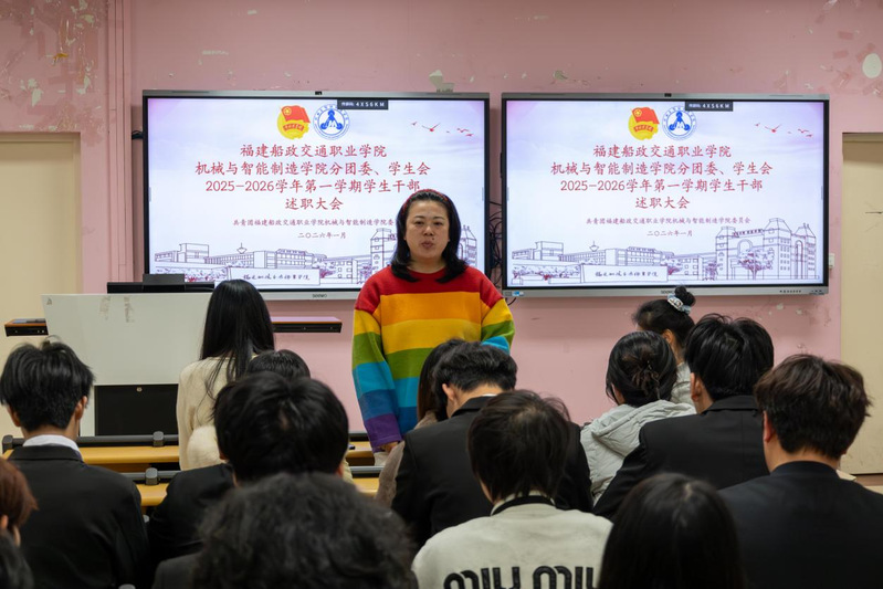 2026年1月7日,共青團(tuán)福建船政交通職業(yè)學(xué)院機械與智能制造學(xué)院委員會兩委學(xué)生干部述職總結(jié)大會在福道園2號樓1-3教室順利召開,本次會議旨在全面總結(jié)2025-2026學(xué)年第一學(xué)期學(xué)生工作成效、查擺問題不足,科學(xué)謀劃新學(xué)期工作計劃,進(jìn)一步提升學(xué)生工作的凝聚力與執(zhí)行力,不斷強化學(xué)生干部隊伍的責(zé)任擔(dān)當(dāng)與服務(wù)意識,切實提升服務(wù)同學(xué)成長成才的能力水平。學(xué)院黨總支書記朱寶杉、院分團(tuán)委書記鄭茜、院分團(tuán)委副書記華銀、院分團(tuán)委組織委員楊榕、院分團(tuán)委宣傳委員官蕾及輔導(dǎo)員林婷出席會議,會議由院分團(tuán)委兼職副書記(學(xué)生)王晨主持。