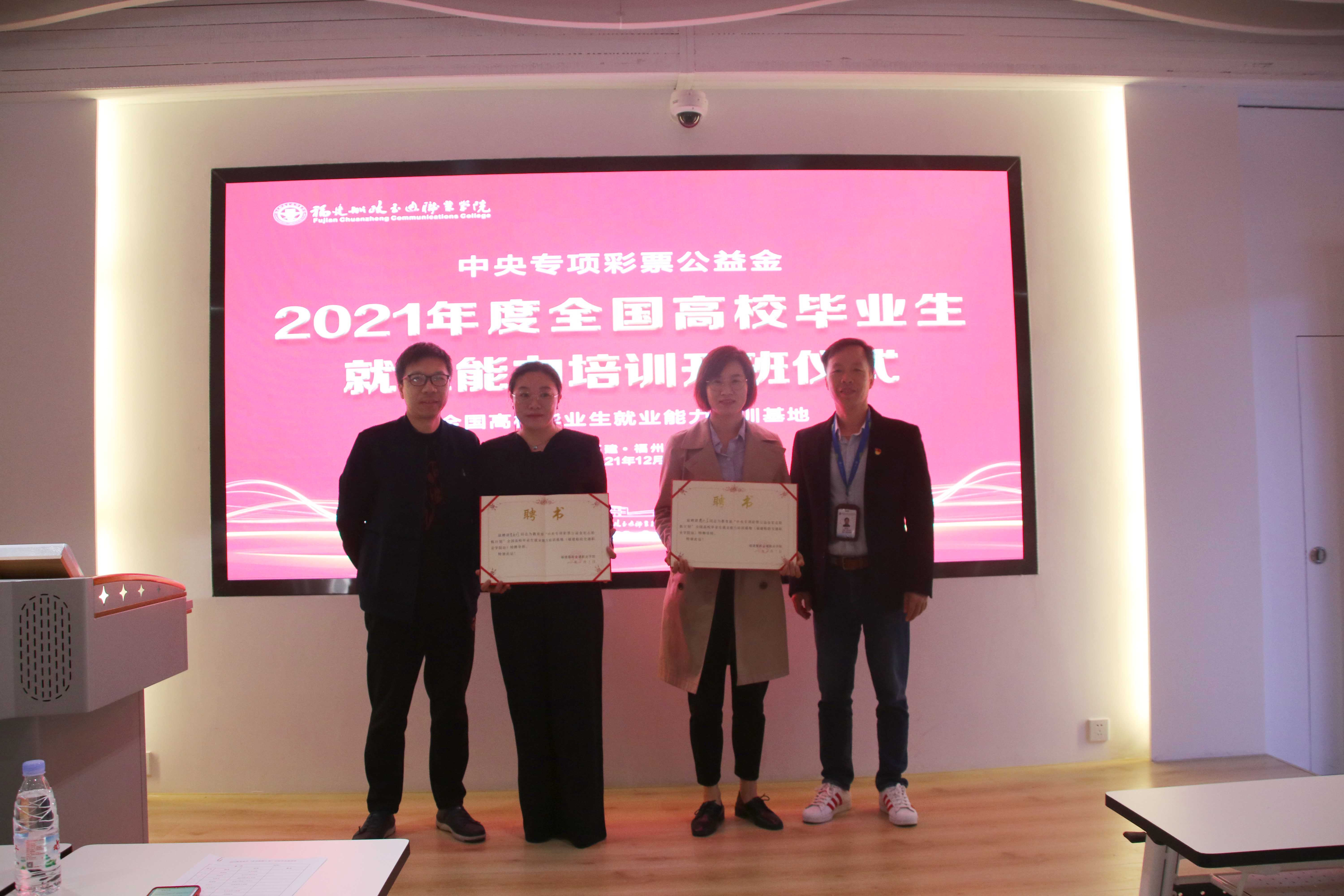 2021年12月11日,“中央專項彩票公益金宏志助航計劃”全國高校畢業(yè)生就業(yè)能力培訓(xùn)開班儀式在福建船政交通職業(yè)學(xué)院黨建館舉行。儀式上,福建船政交通職業(yè)學(xué)院學(xué)工處王心金處長和福建幼兒師范高等??茖W(xué)院創(chuàng)新創(chuàng)業(yè)與實訓(xùn)中心周海林主任為培訓(xùn)導(dǎo)師頒發(fā)了聘書。