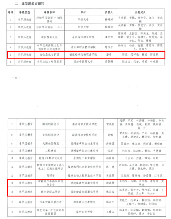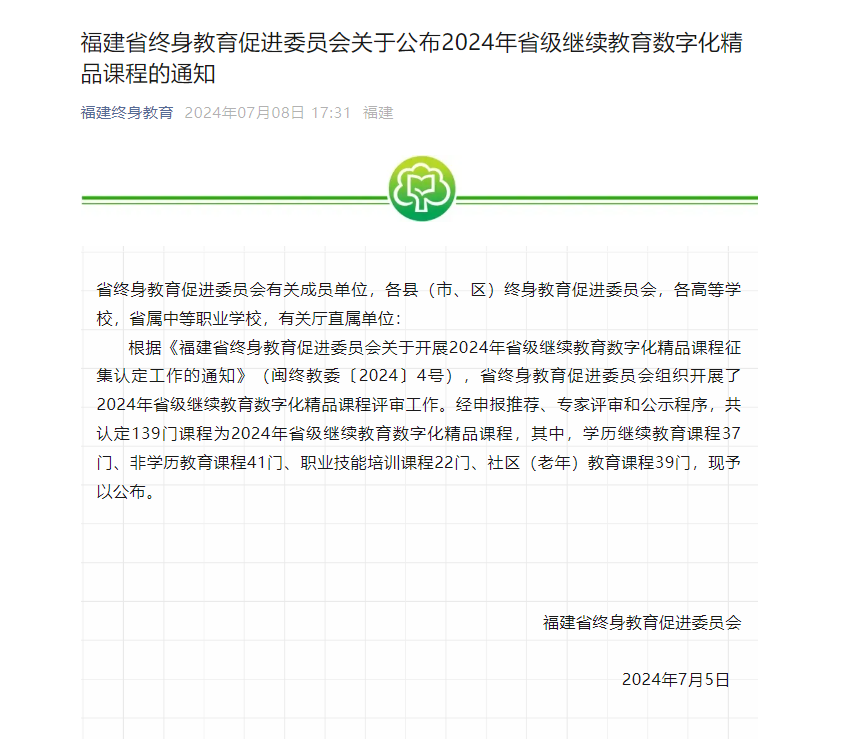 近日,福建省終身教育促進(jìn)委員會(huì)公布《2024年省級(jí)繼續(xù)教育數(shù)字化精品課程》,共認(rèn)定139門(mén)課程為2024年省級(jí)繼續(xù)教育數(shù)字化精品課程,其中,學(xué)歷繼續(xù)教育課程37門(mén)、非學(xué)歷教育課程41門(mén)、職業(yè)技能培訓(xùn)課程22門(mén)、社區(qū)(老年)教育課程39門(mén)。我校非學(xué)歷教育課程《安全急救與護(hù)理》《新能源汽車(chē)高壓系統(tǒng)與安全》《供水管道工培訓(xùn)》、社區(qū)(老年)教育課程《晚年出行新模式》共四門(mén)課程成功入選。