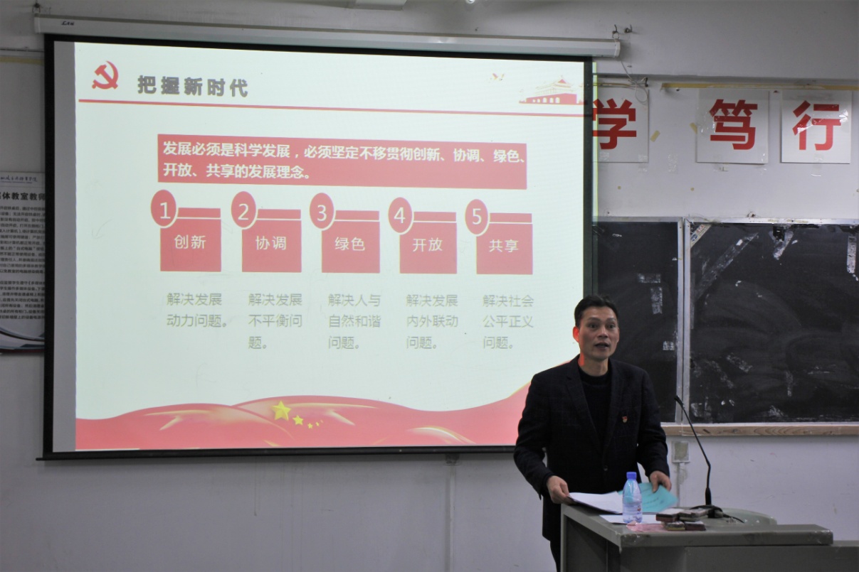 蔡華錦書記以“讀懂新時代 、把握新時代 、實現(xiàn)新時代” 深入學習貫徹習近平新時代中國特色社會主義思想為題,講述了中國特色社會主義進入新時代,在中華人民共和國發(fā)展史上、中華民族發(fā)展史上具有重大意義,在世界社會主義發(fā)展史上、人類社會發(fā)展史上也具有重大意義。“中國特色社會主義進入了新時代,這是我國發(fā)展新的歷史方位”。黨的十九大對我國發(fā)展所處歷史方位作出新的重大政治論斷,具有重大現(xiàn)實意義和深遠歷史意義。我們要深刻領會“新時代”的豐富內(nèi)涵,準確把握我國發(fā)展新的歷史方位,深入開展“不忘初心、牢記使命”主題教育,用習近平新時代中國特色社會主義思想武裝頭腦,更好地肩負起新時代的歷史使命。實現(xiàn)新時代強調(diào)的是觀念的變革,用觀念的變革指導實踐。實現(xiàn)新時代最重要的因素是創(chuàng)新,我國經(jīng)濟由高速增長階段轉向高質(zhì)量發(fā)展階段,創(chuàng)新起到巨大推動作用。站在新的歷史起點,我們將堅持新發(fā)展理念,繼續(xù)實施創(chuàng)新驅動發(fā)展戰(zhàn)略,著力培育和壯大新動能,不斷推動轉方式、調(diào)結構、增動力,推動經(jīng)濟高質(zhì)量發(fā)展,為世界經(jīng)濟增長帶來新的更多機遇,為推動建設開放型世界經(jīng)濟、構建人類命運共同體作出積極貢獻。
