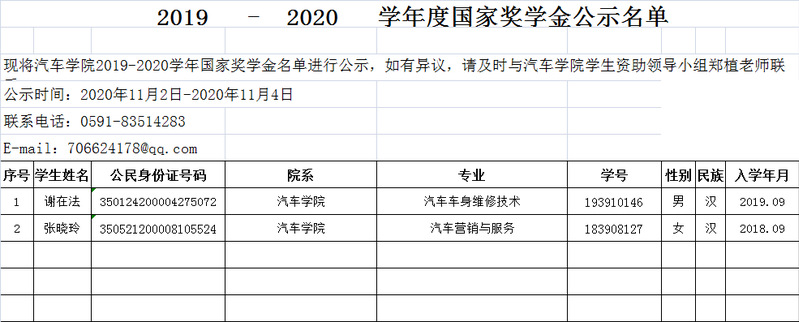 國家獎學(xué)金公示表(汽車學(xué)院)