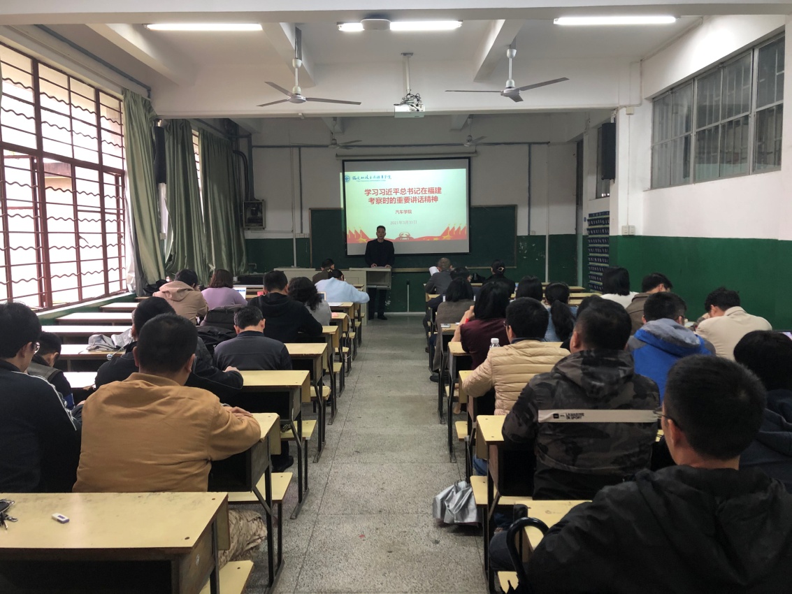 3月31日下午,汽車學院黨總支召開全院教職工大會,學習貫徹習近平總書記來閩考察的重要講話精神,傳達學習《中共福建省委關(guān)于認真學習宣傳貫徹落實習近平總書記在福建考察時的重要講話精神的通知》,學院黨總支書記蔡華錦主持會議并講話。