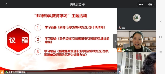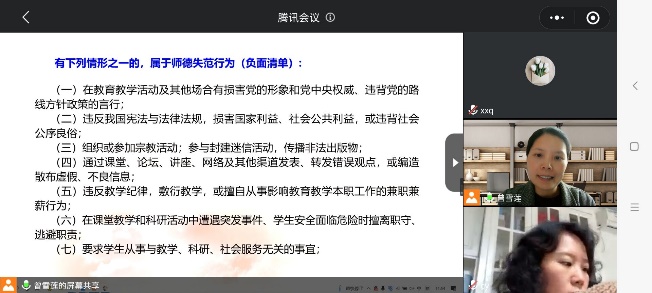 為貫徹落實(shí)習(xí)近平總書記關(guān)于教育的重要論述,貫徹落實(shí)師德師風(fēng)第一標(biāo)準(zhǔn),建設(shè)政治素質(zhì)過硬、業(yè)務(wù)能力精湛、育人水平高超的高素質(zhì)教師隊伍,2022年4月2日中午,汽車學(xué)院第三黨支部在騰訊會議線上舉行“師德師風(fēng)教育學(xué)習(xí)”主題黨日活動,活動由第三支部黨員兼汽檢教研室主任曾雪蓮?fù)局鞒郑麢z教研室全體人員參加。