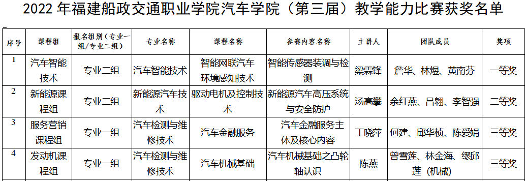 比賽過程中,每組選手從教學(xué)整體設(shè)計、教學(xué)實施過程、學(xué)生學(xué)習(xí)效果和反思改進措施四個方面進行詳細(xì)總結(jié)和展示,體現(xiàn)了學(xué)院教師優(yōu)秀的教學(xué)素養(yǎng),團隊匯報結(jié)束后,專家評委針對參賽作品材料和現(xiàn)場展示情況進行點評和指導(dǎo)。最后由評委參照國賽標(biāo)準(zhǔn)評分,評定出一等獎1個,二等獎1個,三等獎2個,獲獎名單如下: