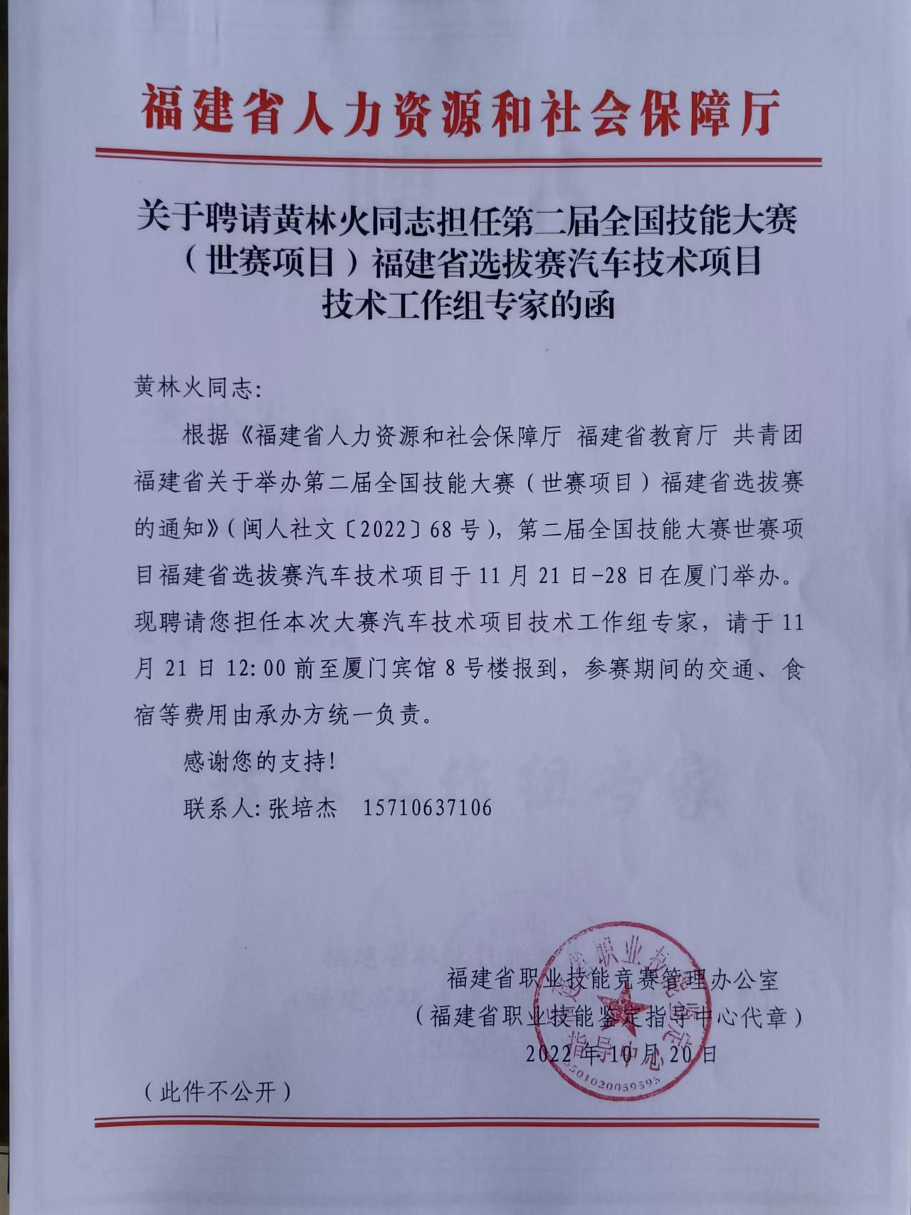 2022年11月25、26、27日,第二屆全國(guó)技能大賽(世賽項(xiàng)目)福建選拔賽汽車(chē)技術(shù)項(xiàng)目在廈門(mén)技師學(xué)院順利舉行。汽車(chē)學(xué)院林可春副院長(zhǎng)與技能大師工作室成員黃林火老師作為技術(shù)專家全程主持了比賽的出題、工位布置、裁判員培訓(xùn)等工作,為選拔賽的順利進(jìn)行做了大量重要工作,受到福建省人社廳職業(yè)技能鑒定指導(dǎo)中心及賽項(xiàng)承辦單位的肯定與好評(píng)。