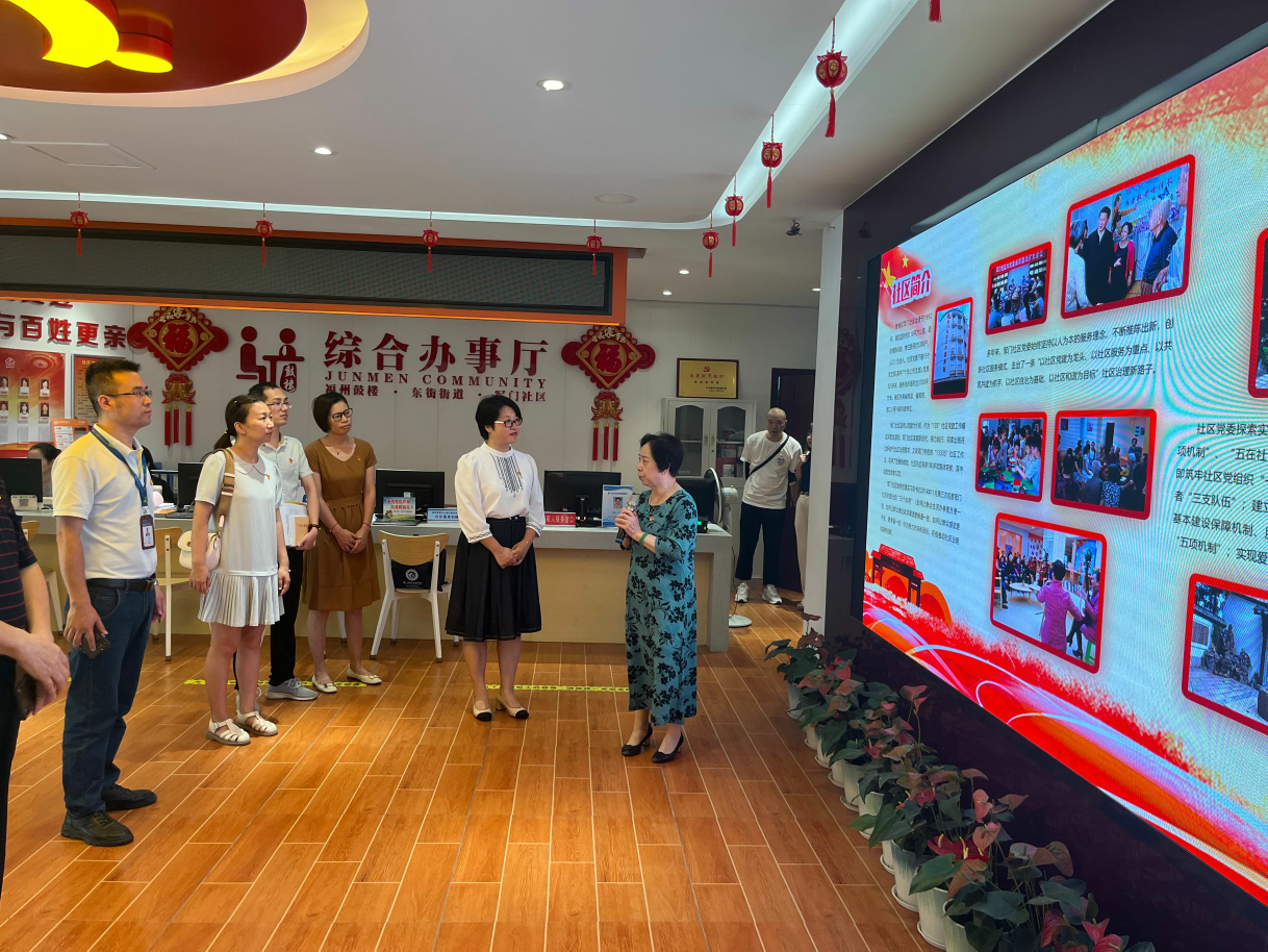 軍門(mén)社區(qū)是聞名全國(guó)的和諧示范社區(qū),曾獲得全國(guó)先進(jìn)基層黨組織、全國(guó)文明單位等多項(xiàng)榮譽(yù)稱號(hào)。軍門(mén)社區(qū)黨委書(shū)記林丹帶領(lǐng)第三支部黨員實(shí)地參觀了軍門(mén)社區(qū)近鄰黨群服務(wù)驛站、便民服務(wù)窗口、社區(qū)居家養(yǎng)老服務(wù)照料中心、青少年科普工作室等基層服務(wù)場(chǎng)所。