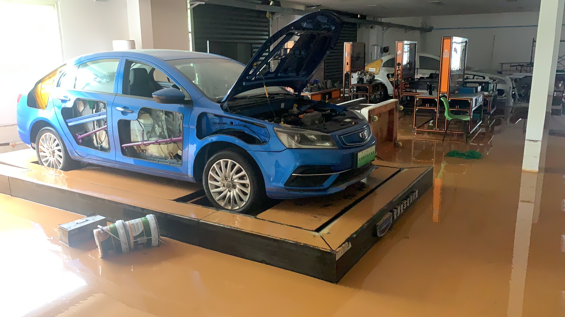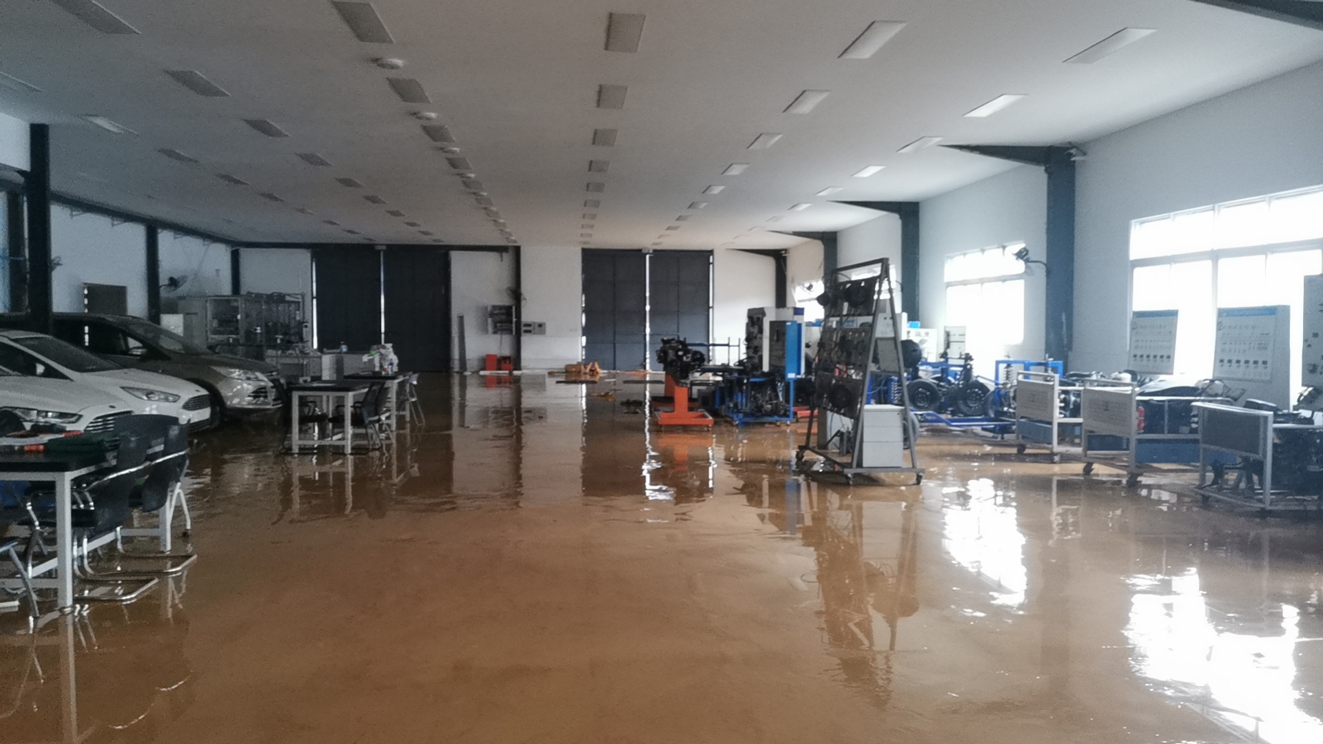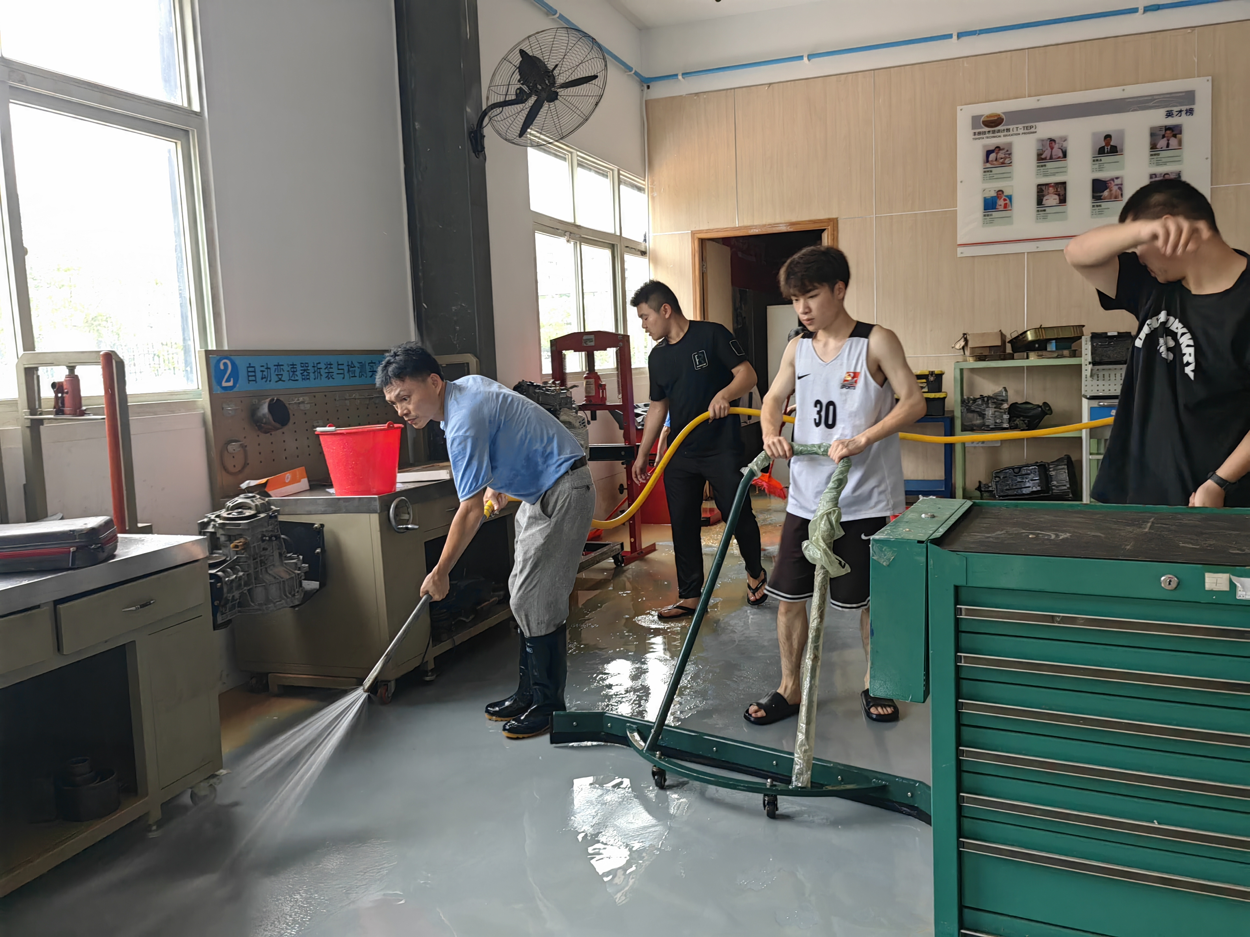 9月5日晚上開始的持續(xù)特大暴雨,學院上下齊心,確保了學生的安全穩(wěn)定。但風雨過后,大量雨水裹挾泥沙滲入實訓室。