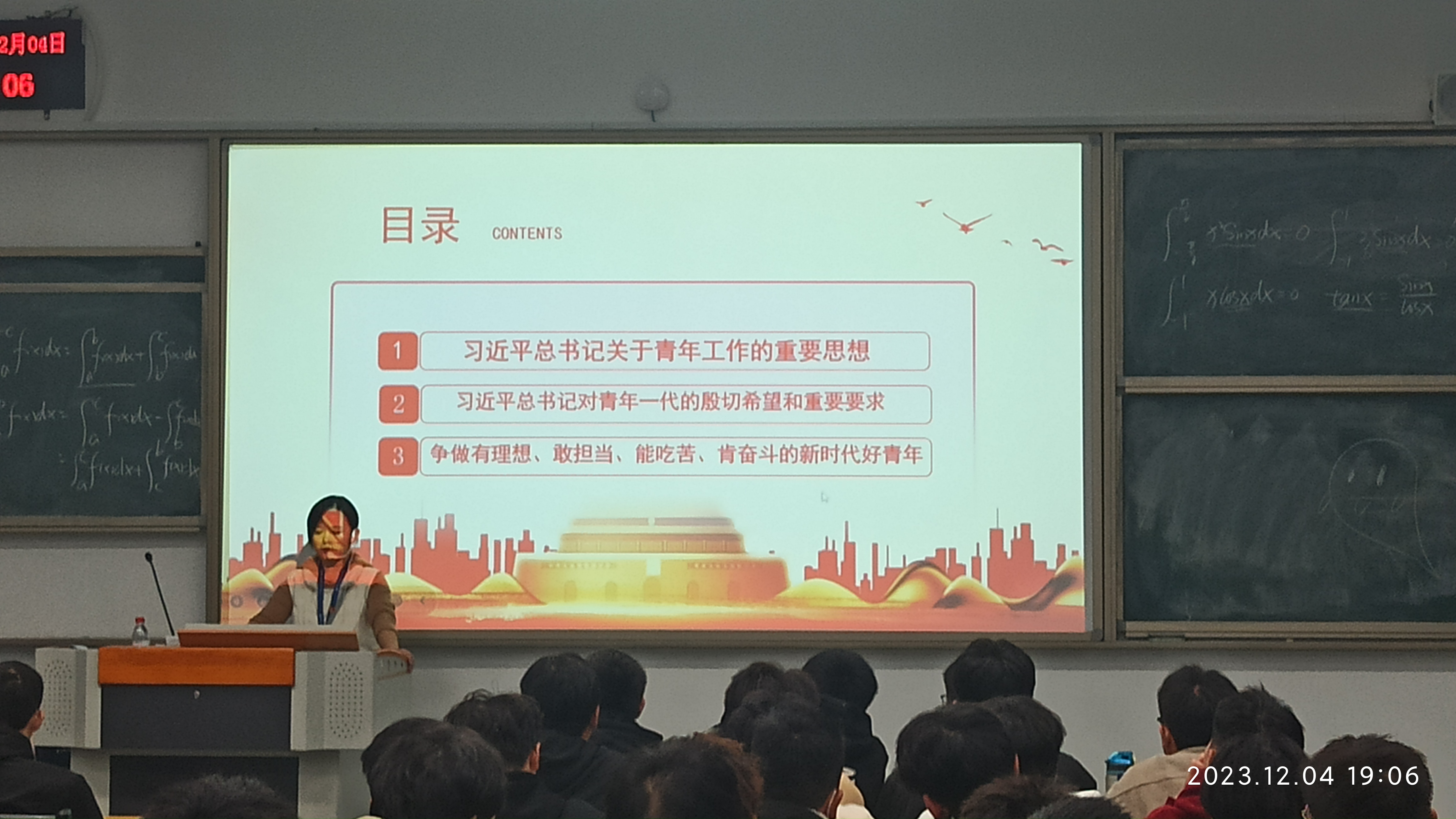 挺鷹擔(dān)當?shù)Z青春,奮楫篤行向未來。為深入學(xué)習(xí)習(xí)近平總書記關(guān)于青年工作的重要思想,以及習(xí)近平總書記對青年一代的殷殷囑托和重要要求,2023年12月4日,汽車學(xué)院分團委團干部教師朱慧君老師,以“挺鷹擔(dān)當?shù)Z青春,奮楫篤行向未來”為主題,面向汽車學(xué)院青年開展宣講活動,進一步激發(fā)汽車青年強國有我的青春激情,爭做有理想、敢擔(dān)當、能吃苦、肯奮斗的新時代好青年,在中國式現(xiàn)代化建設(shè)中挺膺擔(dān)當。