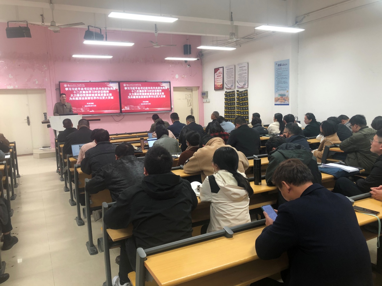 2024年3月13日在2號(hào)樓1-3會(huì)議室汽車學(xué)院組織全體教職工學(xué)習(xí)習(xí)近平總書記在中共中央政治局第十二次集體學(xué)習(xí)時(shí)講話精神,會(huì)議由學(xué)院黨總支書記蔡華錦主持。